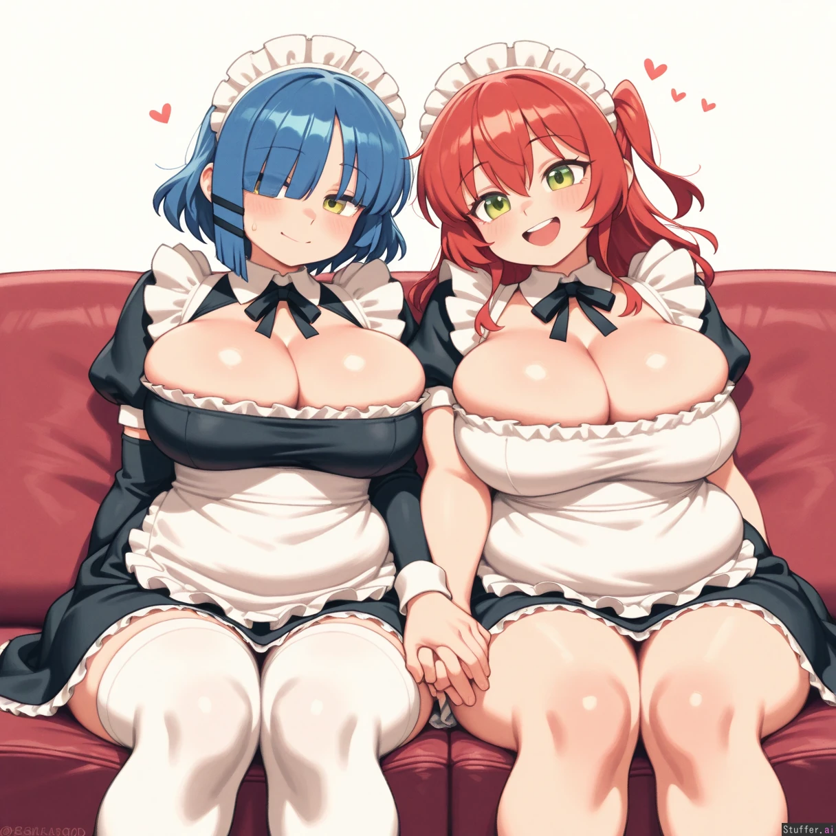 absurdres, 8k, perfect anatomy, masterpiece, beautiful face, beautiful eyes, noodlenood /(artist/) , (wamudraws /(artist/):1.0) 2 girls, couple, Lovebirds, Girl 1: (Yamada Ryo), maid outfit, big breasts, bursting breasts, (inflated breasts: 1.0), bbw, ssbbw, fat arms, fat legs, round face, fat cheeks, fat fingers, fat hands, (obese: 1.0), (bloated belly: 0.5), sitting on sofa Girl 2: maid outfit, ((Kita Ikuyo)), slim, holding hand ((plain white background)), Mutual love, love each other, happy,