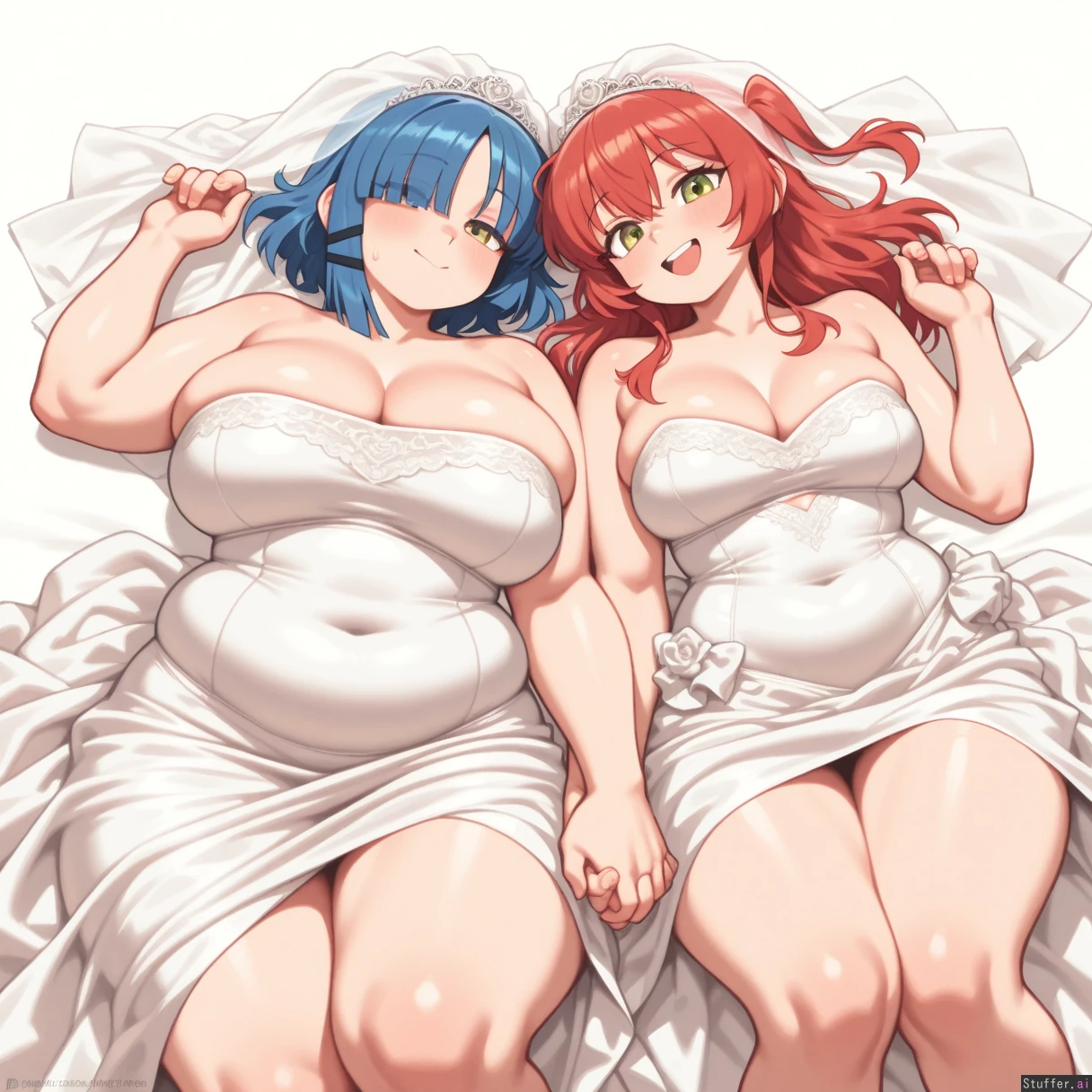 absurdres, 8k, perfect anatomy, masterpiece, beautiful face, beautiful eyes, noodlenood /(artist/) , (wamudraws /(artist/):1.0) 2 girls, couple, Lovebirds, Girl 1: (Yamada Ryo), white wedding dress, big breasts, bursting breasts, (inflated breasts: 1.0), bbw, ssbbw, fat arms, fat legs, round face, fat cheeks, fat fingers, fat hands, (obese: 1.0), (bloated belly: 0.5), lying on bed Girl 2: white wedding dress, ((Kita Ikuyo)), slim, holding hand ((plain white background)), Mutual love, love each other, happy,