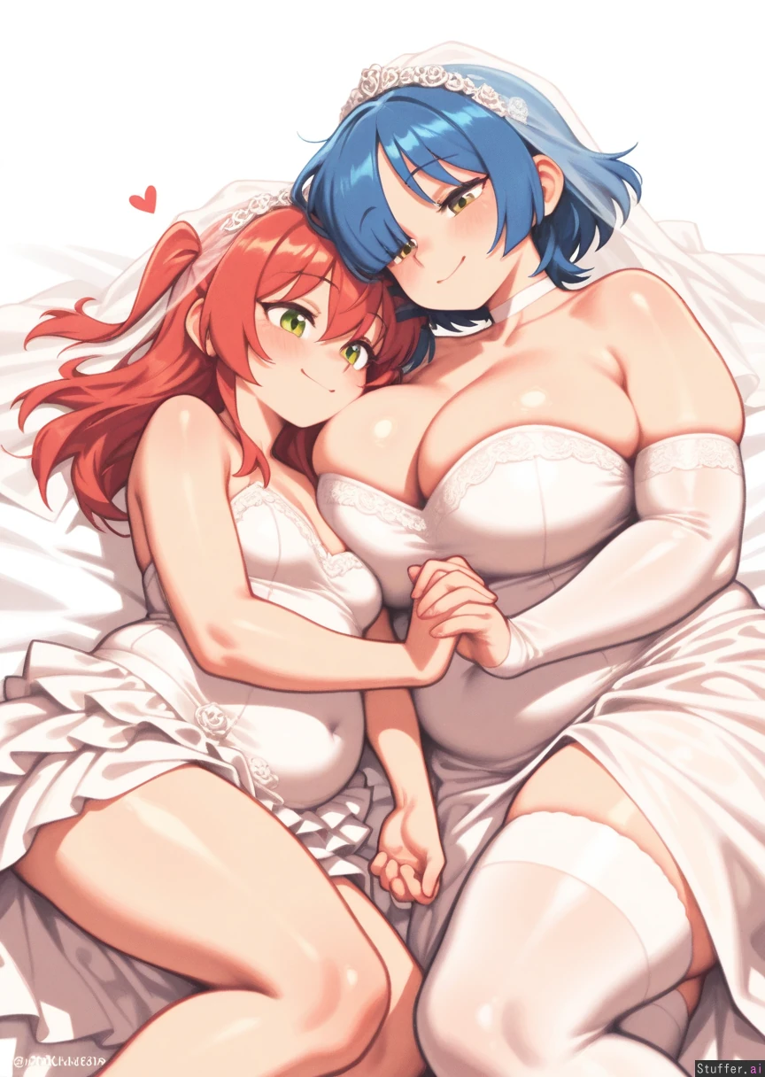 absurdres, 8k, perfect anatomy, masterpiece, beautiful face, beautiful eyes, noodlenood /(artist/) , (wamudraws /(artist/):1.0) 2 girls, couple, Lovebirds, Girl 1: (Yamada Ryo), white wedding dress, big breasts, bursting breasts, (inflated breasts: 1.0), bbw, ssbbw, fat arms, fat legs, round face, fat cheeks, fat fingers, fat hands, (obese: 1.0), (bloated belly: 0.5), lying on bed Girl 2: white wedding dress, ((Kita Ikuyo)), slim, holding hand ((plain white background)), Mutual love, love each other, happy,