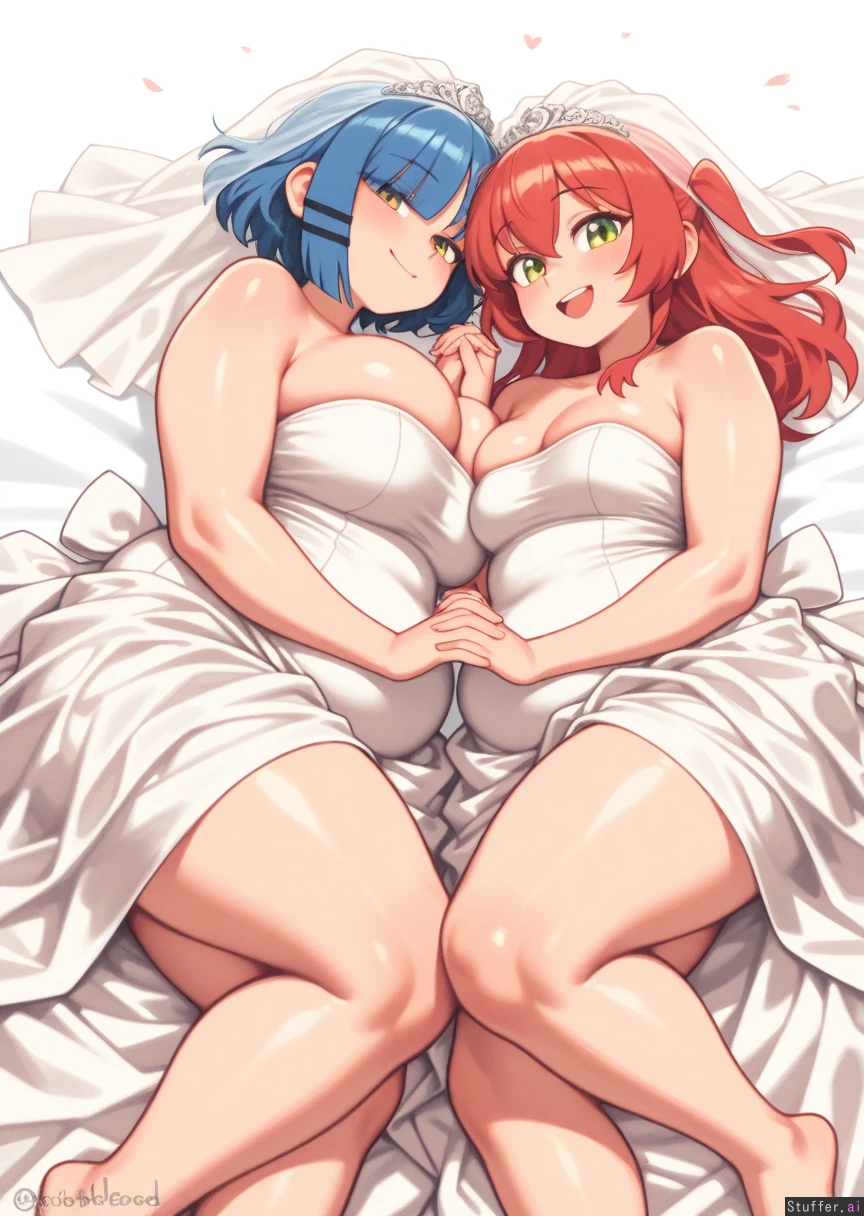 absurdres, 8k, perfect anatomy, masterpiece, beautiful face, beautiful eyes, noodlenood /(artist/) , (wamudraws /(artist/):1.0) 2 girls, couple, Lovebirds, Girl 1: (Yamada Ryo), white wedding dress, big breasts, bursting breasts, (inflated breasts: 1.0), bbw, ssbbw, fat arms, fat legs, round face, fat cheeks, fat fingers, fat hands, (obese: 1.0), (bloated belly: 0.5), lying on bed Girl 2: white wedding dress, ((Kita Ikuyo)), slim, holding hand ((plain white background)), Mutual love, love each other, happy,