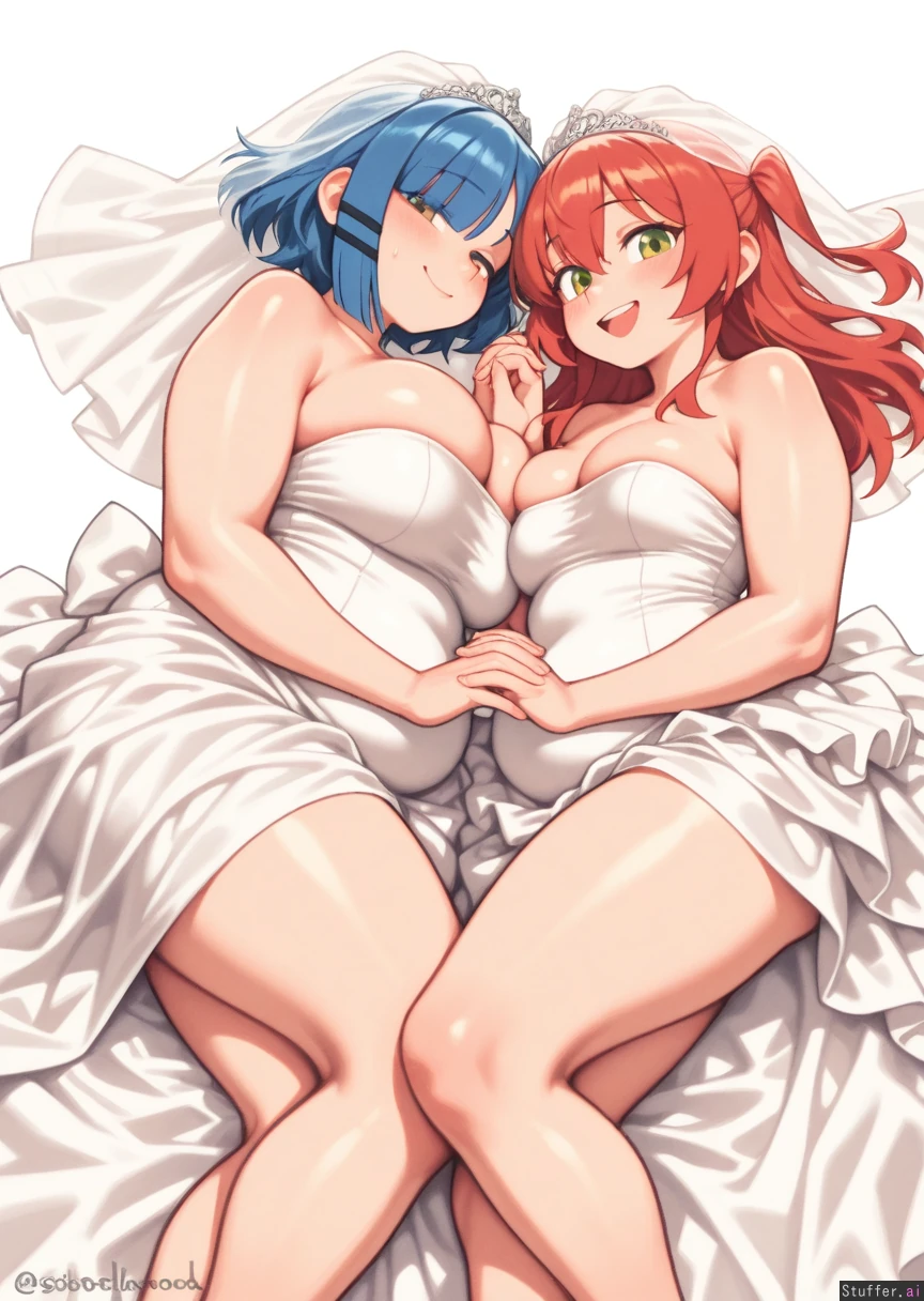 absurdres, 8k, perfect anatomy, masterpiece, beautiful face, beautiful eyes, noodlenood /(artist/) , (wamudraws /(artist/):1.0) 2 girls, couple, Lovebirds, Girl 1: (Yamada Ryo), white wedding dress, big breasts, bursting breasts, (inflated breasts: 1.0), bbw, ssbbw, fat arms, fat legs, round face, fat cheeks, skinny fingers, skinny hands, (obese: 1.0), (bloated belly: 0.5), lying on bed Girl 2: white wedding dress, ((Kita Ikuyo)), slim, holding hand ((plain white background)), Mutual love, love each other, happy,