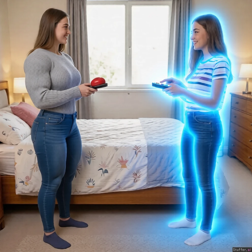 The right girl is pressing the button on her remote control with her finger. Make a bright blue glow around the right girl her body.