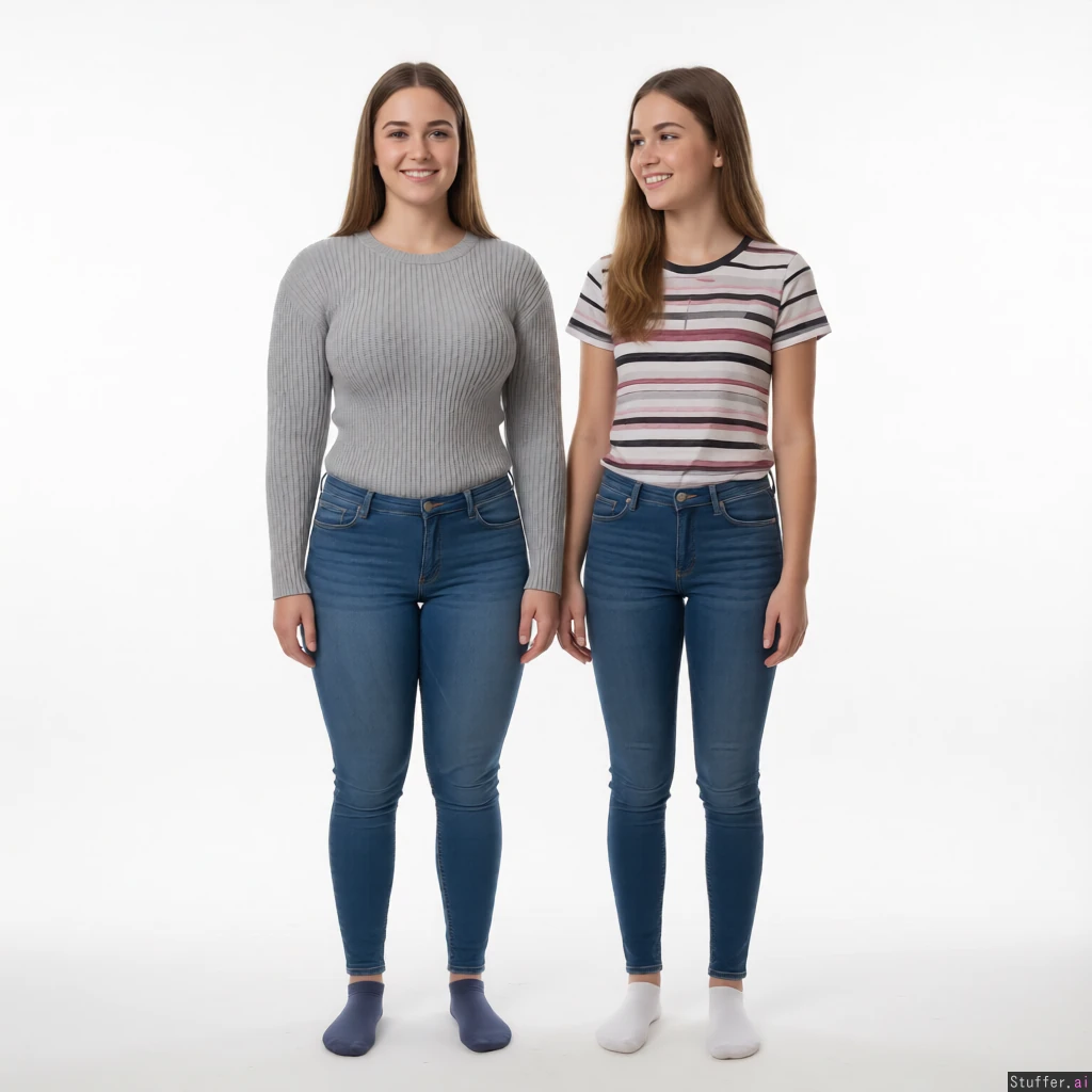 Make a image with both girls standing straight in front of a white back ground. Remove the remote controls.