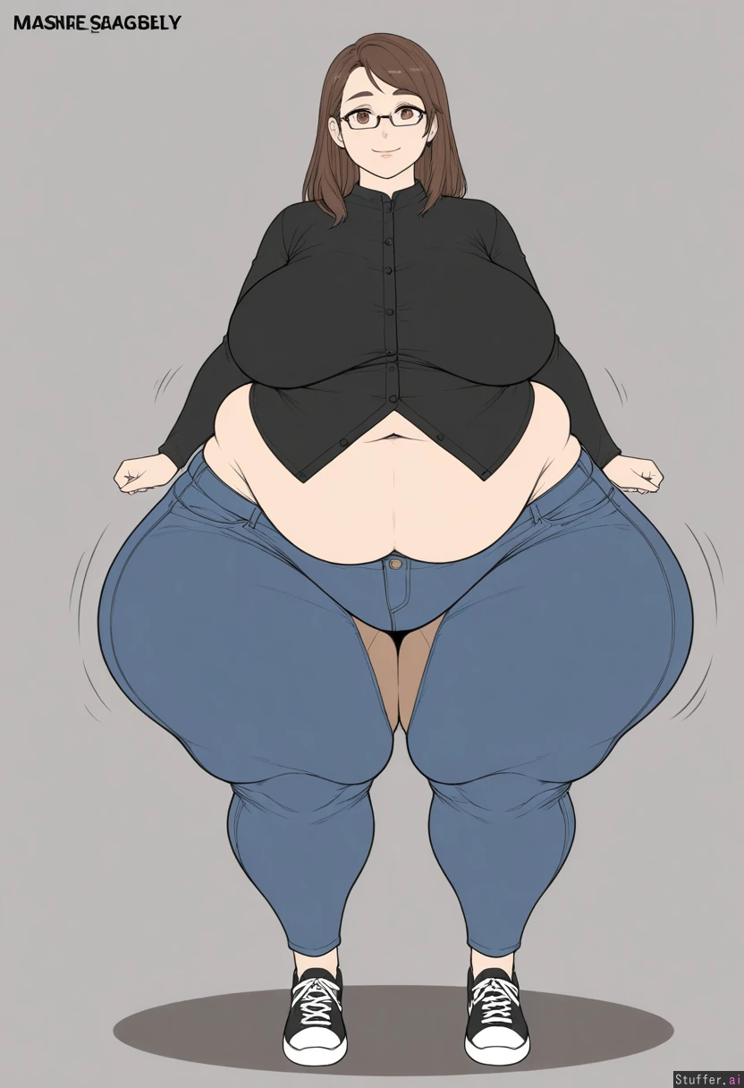 ((high quality, good anatomy, flat colors, detailed face, no_text)),solo, fat face,((high quality, detailed face, good anatomy, flat color, simple shading, realistic, realism, front view, Solo)),(((1 woman))), ((average beauty college woman)), caucasian, attractive adult Caucasian woman ((view from front, solo:1.7)), 1girl, solo Flat color, female, mature 21 year old woman, plump lips, soft brown hair, long shaggy brown hair, (5 feet short woman), (((tight jeans, black buttoned long sleeve shirt), attractive face, rectangular face shape, black running sneakers, brown eyes, thick brown eyebrows,slight bashful smile, front_view))), lips together obese, overweight, bbw, ssbbw,chubby,((Hyper impossibly wide hips, massive fat legs,hyper massive fat lowe thighs:1.8)), thicc, wide hips,curvaceous ((thighs and hips expansion:1.7)), (big saggy belly, chubby belly, huge hanging belly, overflowing muffintop:1.7), large plump fat breasts, sagging_breasts, (((massive sagging thighs:1.8))), (((fat knees:1.5))),