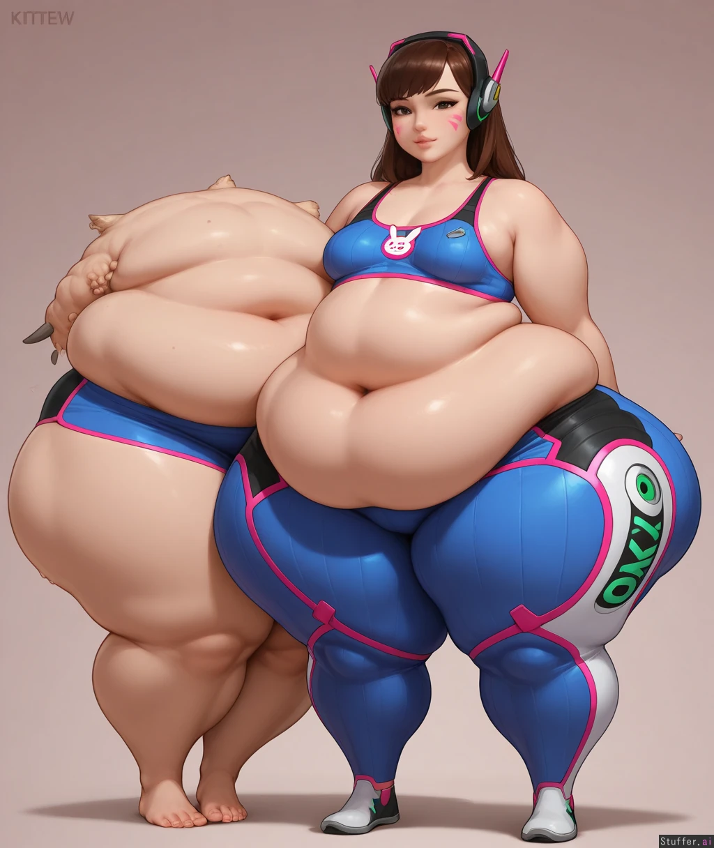 High resolution, solo, ((best quality), (high rating), absurd res, high res, detailed, ultra quality, ((high quality)), masterpiece, (ultra high resolution), stunning beauty, detailed face, intricate detail, sophisticated detail, exquisite detail, perfect 2D art, realistic lighting, realistic shading, correct anatomy, 8k, (highly detailed face), highly detailed skin texture, ((anime)), (solo)), ((kittew (artist))), ((D.va (overwatch), sports bra, leggings)), chubby, hyper curvy, ((incredibly obese)), ((narrow waist, small breasts)), full body view, incredibly wide hips, top heavy, huge soft thighs, (((hyper wide hips, incredibly fat soft thighs, thick calves, fat legs, hyper thighs, disproportionately fat legs, flabby thighs, fat thighs, the fattest legs, huge chunky legs, massively obese legs, cankles, fat feet))), fat mons, ((wide chunky square hips, cellulite, fat rolls, obese legs, hyper flabby legs, soft heavy sagging flab))