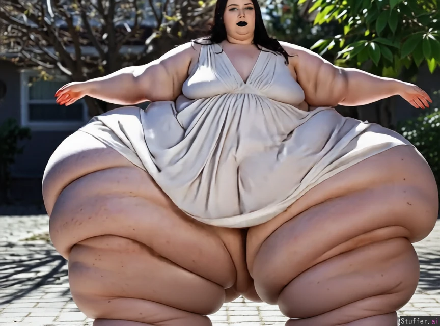 detailed and ultra realistic. make her legs wider and fatter, covered in soft cellulite and fat rolls. hair black, winged eyeliner, black lipstick, full body in frame