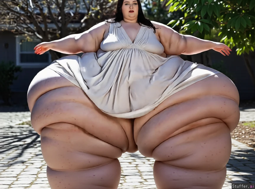 detailed and ultra realistic. make her legs wider and fatter, covered in soft cellulite and fat rolls. hair black, winged eyeliner, black lipstick, full body in frame