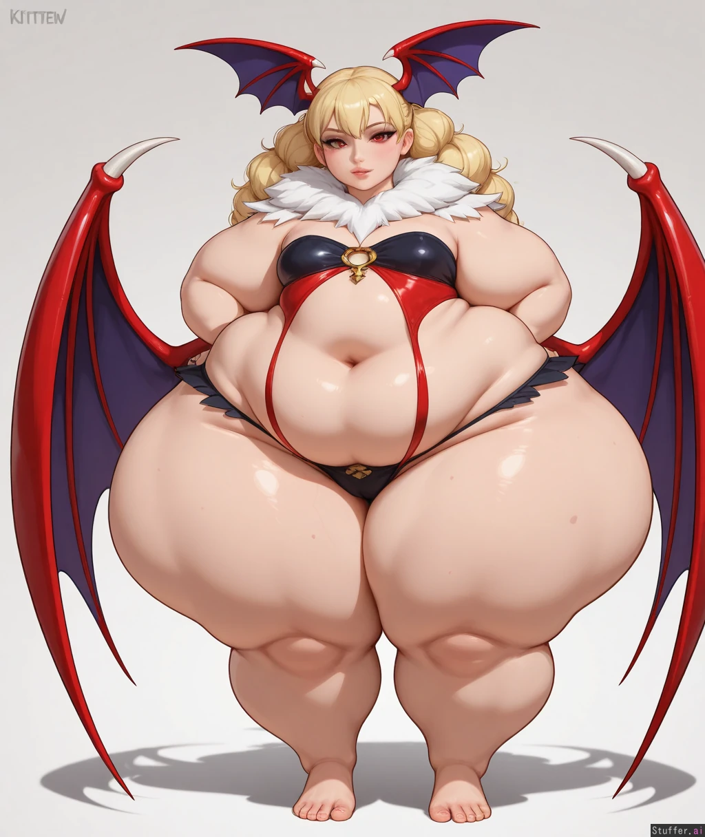 High resolution, solo, ((best quality), (high rating), absurd res, high res, detailed, ultra quality, ((high quality)), masterpiece, (ultra high resolution), stunning beauty, detailed face, intricate detail, sophisticated detail, exquisite detail, perfect 2D art, realistic lighting, realistic shading, correct anatomy, 8k, (highly detailed face), highly detailed skin texture, ((anime)), (solo)), ((kittew (artist))), ((Lilith (darkstalkers))), chubby, hyper curvy, ((narrow waist, small breasts)), full body view, incredibly wide hips, top heavy, huge soft thighs, (((hyper wide hips, incredibly fat soft thighs, thick calves, fat legs, hyper thighs, disproportionately fat legs, flabby thighs, fat thighs, the fattest legs, huge chunky legs, massively obese legs, cankles, fat feet))), fat mons, ((wide chunky square hips, cellulite, fat rolls, obese legs, hyper flabby legs, soft heavy sagging flab))