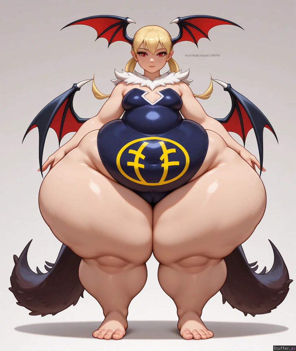 High resolution, solo, ((best quality), (high rating), absurd res, high res, detailed, ultra quality, ((high quality)), masterpiece, (ultra high resolution), stunning beauty, detailed face, intricate detail, sophisticated detail, exquisite detail, perfect 2D art, realistic lighting, realistic shading, correct anatomy, 8k, (highly detailed face), highly detailed skin texture, ((anime)), (solo)), ((kittew (artist))), ((Lilith (darkstalkers))), chubby, hyper curvy, ((narrow waist, small breasts)), full body view, incredibly wide hips, top heavy, huge soft thighs, (((hyper wide hips, incredibly fat soft thighs, thick calves, fat legs, hyper thighs, disproportionately fat legs, flabby thighs, fat thighs, the fattest legs, huge chunky legs, massively obese legs, cankles, fat feet))), fat mons, ((wide chunky square hips, cellulite, fat rolls, obese legs, hyper flabby legs, soft heavy sagging flab))