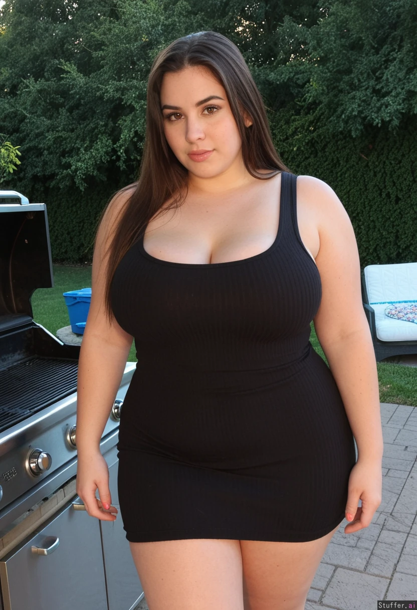 perfect anatomy. ((((candid)) amateur photograph with good lighting)) of ((hot instagram model girl)) with a (cute seductive face) at a barbecue. she is wearing a skin-tight form-fitting ribbed dress. she is a chubby latina brunette with ((huge wide hips)), a (thin waist), and (((huge thighs))). she has a bloated belly. perfect proportions. she is a shy good girl.