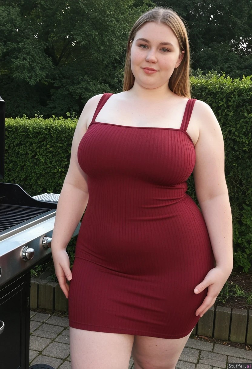 perfect anatomy. ((((candid)) amateur photograph with good lighting)) of ((hot instagram model girl)) with a (cute seductive face) at a barbecue. she is wearing a skin-tight form-fitting ribbed dress. she is a chubby swedish girl with ((huge wide hips)), a (thin waist), and (((huge thunder thighs))). she has a bloated belly. perfect proportions. she is a shy good girl.