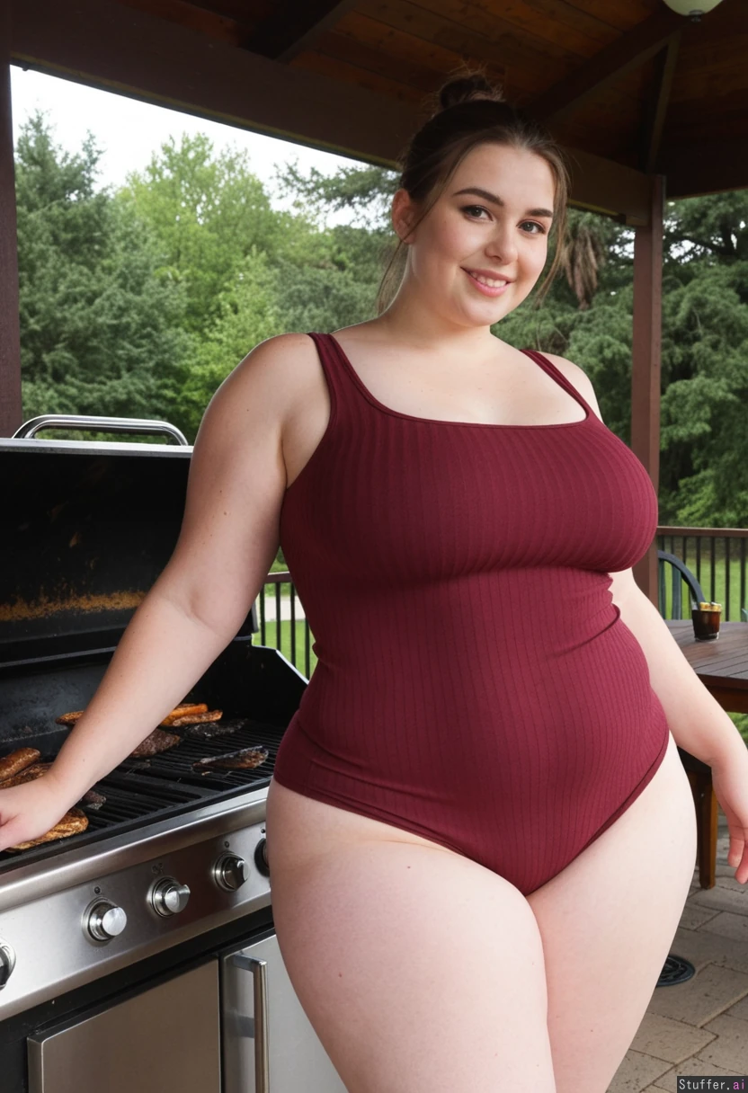 perfect anatomy. ((((candid)) amateur photograph with good lighting)) of ((hot instagram model girl)) with a (cute seductive face) at a barbecue. she is wearing a skin-tight form-fitting ribbed dress. ((perfect skinny american model face)). she is a chubby ((american model)) with ((huge wide hips)), a (thin waist), and (((huge thunder thighs))). ((she has a bloated belly)). perfect proportions. she is a shy good girl.