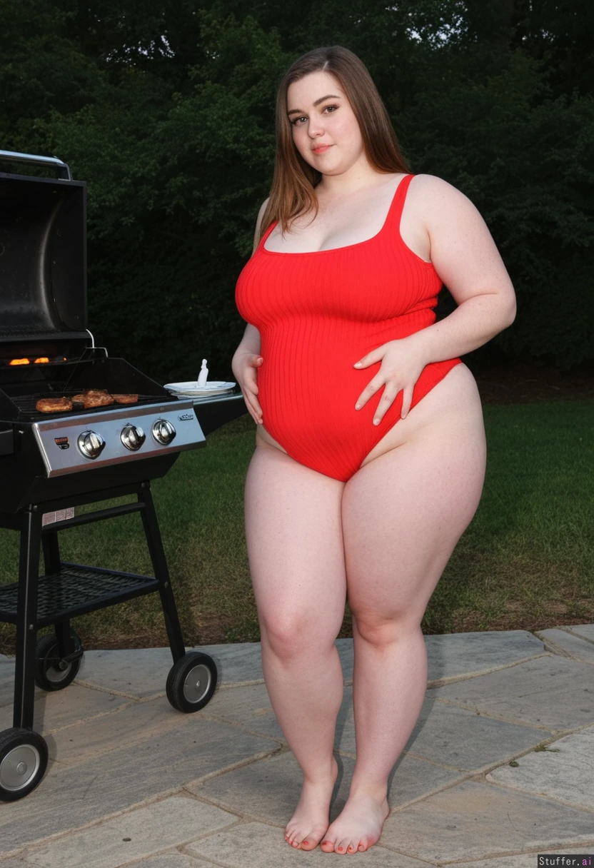 perfect anatomy. ((((candid)) amateur photograph with good lighting)) of ((hot instagram model girl)) with a (cute seductive face) at a barbecue. she is wearing a skin-tight form-fitting ribbed dress. ((perfect skinny hot face)). she is a chubby ((american model)) with ((huge wide hips)), a (thin waist), and (((huge thunder thighs))). ((she has a bloated belly)). perfect proportions. she is a shy good girl. ((obese body with a skinny face)).