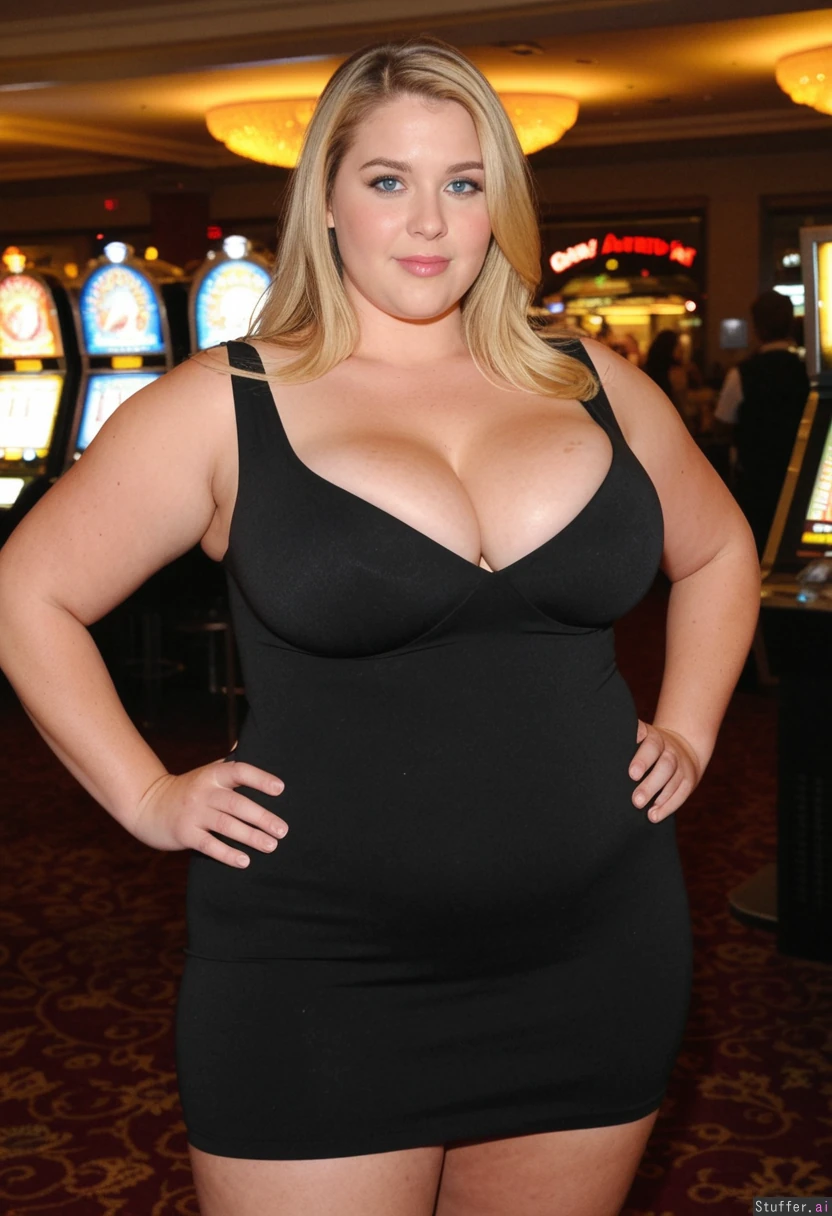 perfect anatomy. ((((candid)) amateur photograph with good lighting)) of ((hot american celebrity girl)) with a (cute seductive face) at a casino. she is wearing an ((elegant skin-tight dress)). she is a chubby (((american model))) with tan skin, ((huge wide hips)), a (thin waist), and (((huge thunder thighs))). ((she has a bloated chubby belly)). perfect proportions. she is a shy good girl. ((cleavage)). blonde hair, blue eyes.