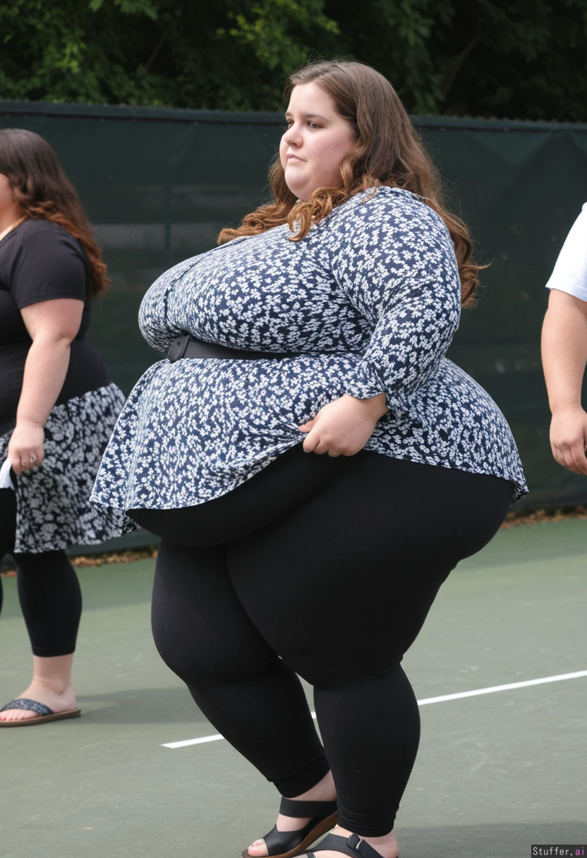 Candid photo 23 year old very oversized morbidly obese fat ssbbw, light brown hair, brown eyes, Oversized tight blue peplum Floral blouse, oversized stretched long charcoal leggings, standing, noticing recent weight gain, gorgeous, tight waistband, gorgeous, sandles, beautiful, sandles, candid photo, white ribbon belt, Side view Long massive blouse Long wavy hairstyle Fat puffed up love handles Playing outside tennis with friends Daytime Fully clothed, fully covered weight gain, very bloated, Lumpy love handles Gut sticks out very fat in front Big leggings Big blouse Painfully bloated gut Hyper fat arms Massive love handles Big fat chunky legs Enormous fat soft love handles Massive huge leggings Massive blouse Very bloated Ultra chunky love handles Enormous belly Really bloated gut Huge gut Hyper massive fat love handles Bloated gut Oversized blouse Oversized leggings