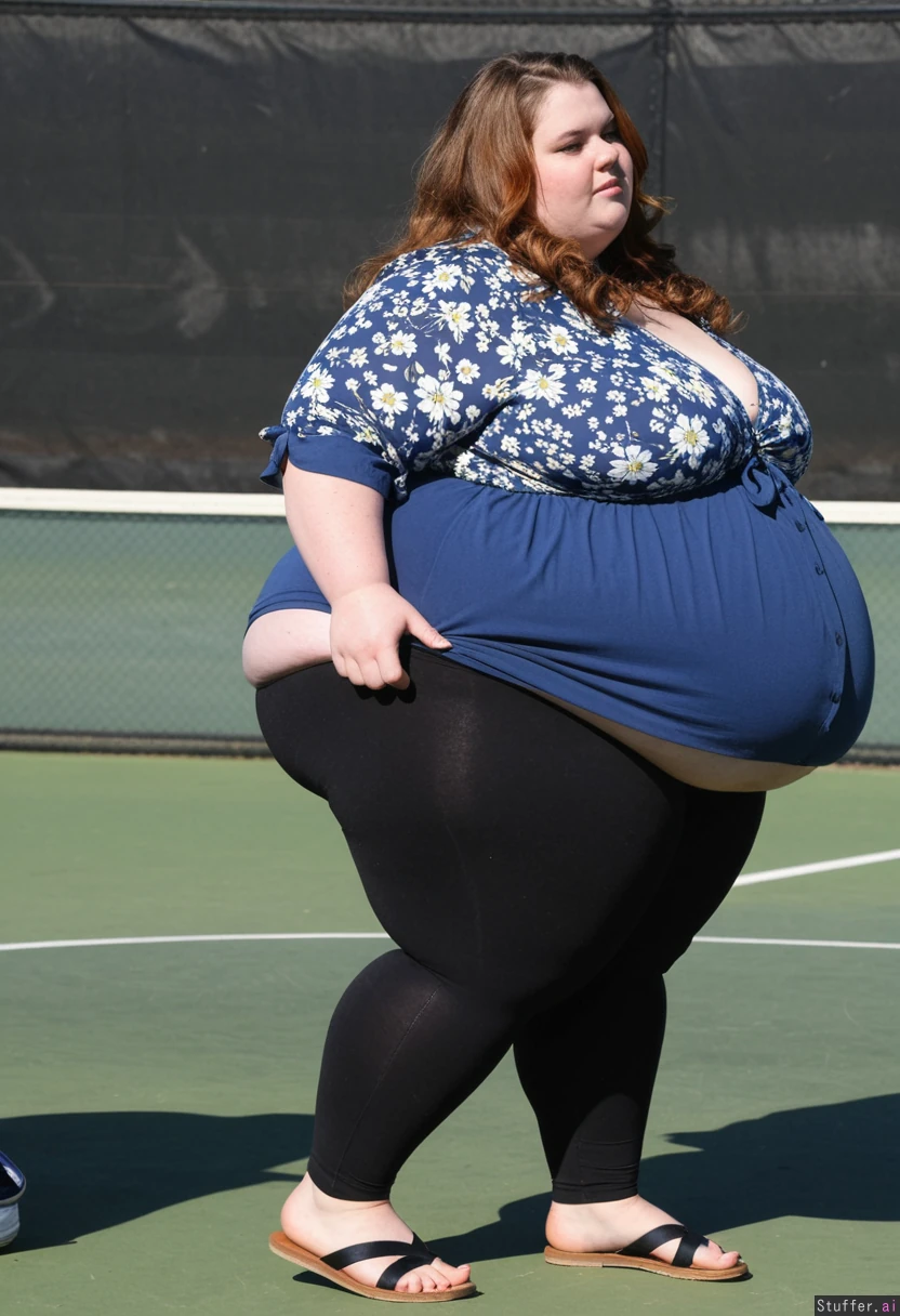 Candid photo 23 year old very oversized morbidly obese fat ssbbw, light brown hair, brown eyes, Oversized tight blue peplum Floral blouse, oversized stretched long charcoal leggings, standing, noticing recent weight gain, gorgeous, tight waistband, gorgeous, sandles, beautiful, sandles, candid photo, white ribbon belt, Side view Long massive blouse Long wavy hairstyle Fat puffed up love handles Playing outside tennis with friends Daytime Fully clothed, fully covered weight gain, very bloated, Lumpy love handles Gut sticks out very fat in front Big leggings Big blouse Painfully bloated gut Hyper fat arms Massive love handles Big fat chunky legs Enormous fat soft love handles Massive huge leggings Massive blouse Very bloated Ultra chunky love handles Enormous belly Really bloated gut Huge gut Hyper massive fat love handles Bloated gut Oversized blouse Oversized leggings