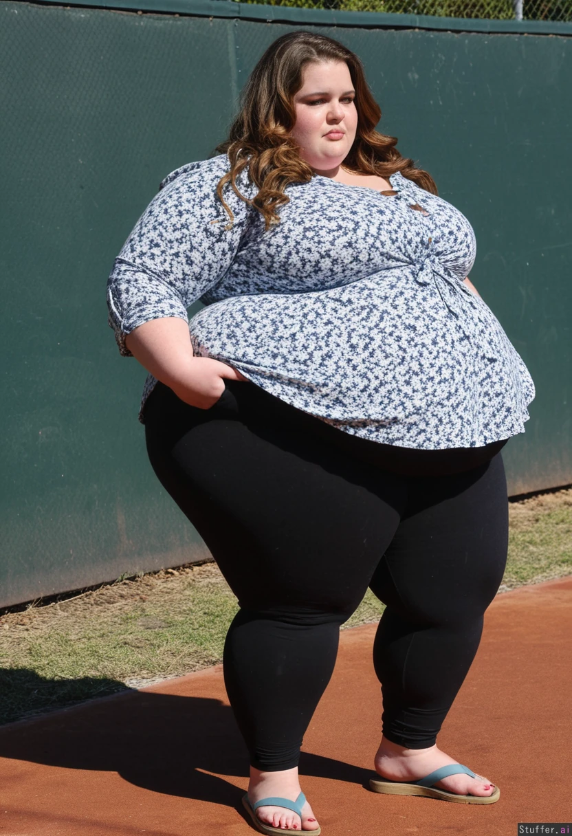 Candid photo 23 year old very oversized morbidly obese fat ssbbw, light brown hair, brown eyes, Oversized tight blue peplum Floral blouse, oversized stretched long charcoal leggings, standing, noticing recent weight gain, gorgeous, tight waistband, gorgeous, sandles, beautiful, sandles, candid photo, white ribbon belt, Side view Long massive blouse Long wavy hairstyle Fat puffed up love handles Playing outside tennis with friends Daytime Fully clothed, fully covered weight gain, very bloated, Lumpy love handles Gut sticks out very fat in front Big leggings Big blouse Painfully bloated gut Hyper fat arms Massive love handles Big fat chunky legs Enormous fat soft love handles Massive huge leggings Massive blouse Very bloated Ultra chunky love handles Enormous belly Really bloated gut Huge gut Hyper massive fat love handles Bloated gut Oversized blouse Oversized leggings
