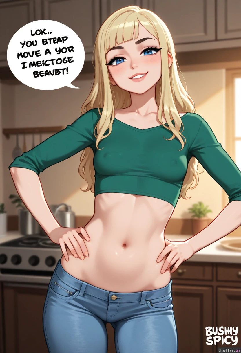 (c.cu), blushyspicy, KAMII MOMORU (artist), betterwithsalt, best quality, (anime), beautiful, intricate details, hdr 1woman, gorgeous, beautiful, ((mature, milf)), (looking at viewer), blonde hair, light-blue eyes, (hair bangs), long hair, looking at viewer, sexy pose, wide hips, erect nipples, smirk, slight side view Crop top, skinny jeans, arms on hips Posing in kitchen, warm lighting, (Slim figure:1.85), (small breasts), (morbidly obese ssbbw:1.00), (large overfed hanging belly:1.0), (chubby face:1.0), (fatter features:1.0) chubby_belly