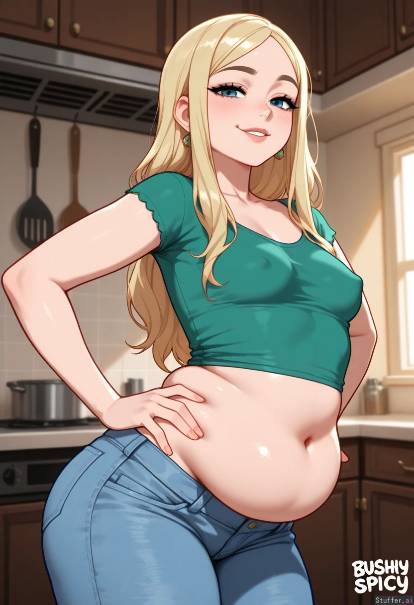 (c.cu), blushyspicy, KAMII MOMORU (artist), betterwithsalt, best quality, (anime), beautiful, intricate details, hdr 1woman, gorgeous, beautiful, ((mature, milf)), (looking at viewer), blonde hair, light-blue eyes, (hair bangs), long hair, looking at viewer, sexy pose, wide hips, erect nipples, smirk, slight side view Crop top, skinny jeans, arms on hips Posing in kitchen, warm lighting, (Slim figure:1.25), (small breasts), (morbidly obese ssbbw:1.00), (large overfed hanging belly:1.0), (chubby face:1.0), (fatter features:1.0) chubby_belly