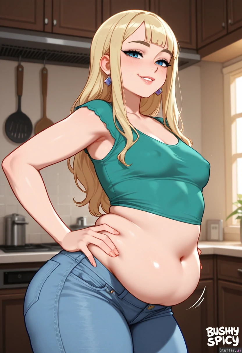(c.cu), blushyspicy, KAMII MOMORU (artist), betterwithsalt, best quality, (anime), beautiful, intricate details, hdr 1woman, gorgeous, beautiful, ((mature, milf)), (looking at viewer), blonde hair, light-blue eyes, (hair bangs), long hair, looking at viewer, sexy pose, wide hips, erect nipples, smirk, slight side view Crop top, skinny jeans, arms on hips Posing in kitchen, warm lighting, (Slim figure:0.0), (small breasts), (morbidly obese ssbbw:1.00), (large overfed hanging belly:1.0), (chubby face:1.0), (fatter features:1.0) chubby_belly