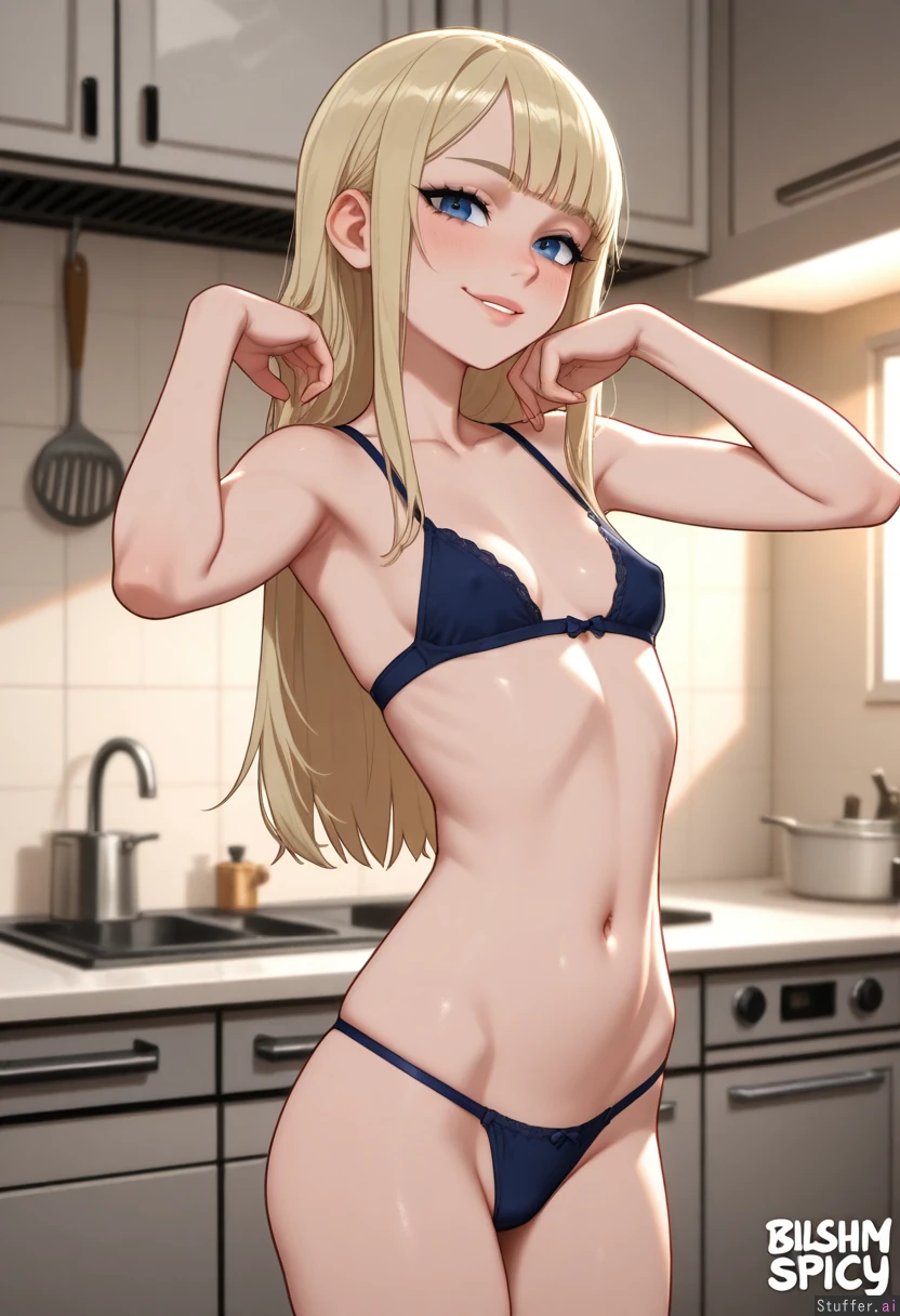 (c.cu), blushyspicy, KAMII MOMORU (artist), betterwithsalt, best quality, (anime), beautiful, intricate details, hdr 1woman, gorgeous, beautiful, ((mature, milf)), (looking at viewer), blonde hair, light-blue eyes, (hair bangs), long hair, looking at viewer, sexy pose, wide hips, erect nipples, smirk, slight side view Nude Posing in kitchen, warm lighting, (Slim figure:1.85), (small breasts), (morbidly obese ssbbw:1.00), (large overfed hanging belly:1.0), (chubby face:1.0), (fatter features:1.0) naked naked_female no_bra no_panties