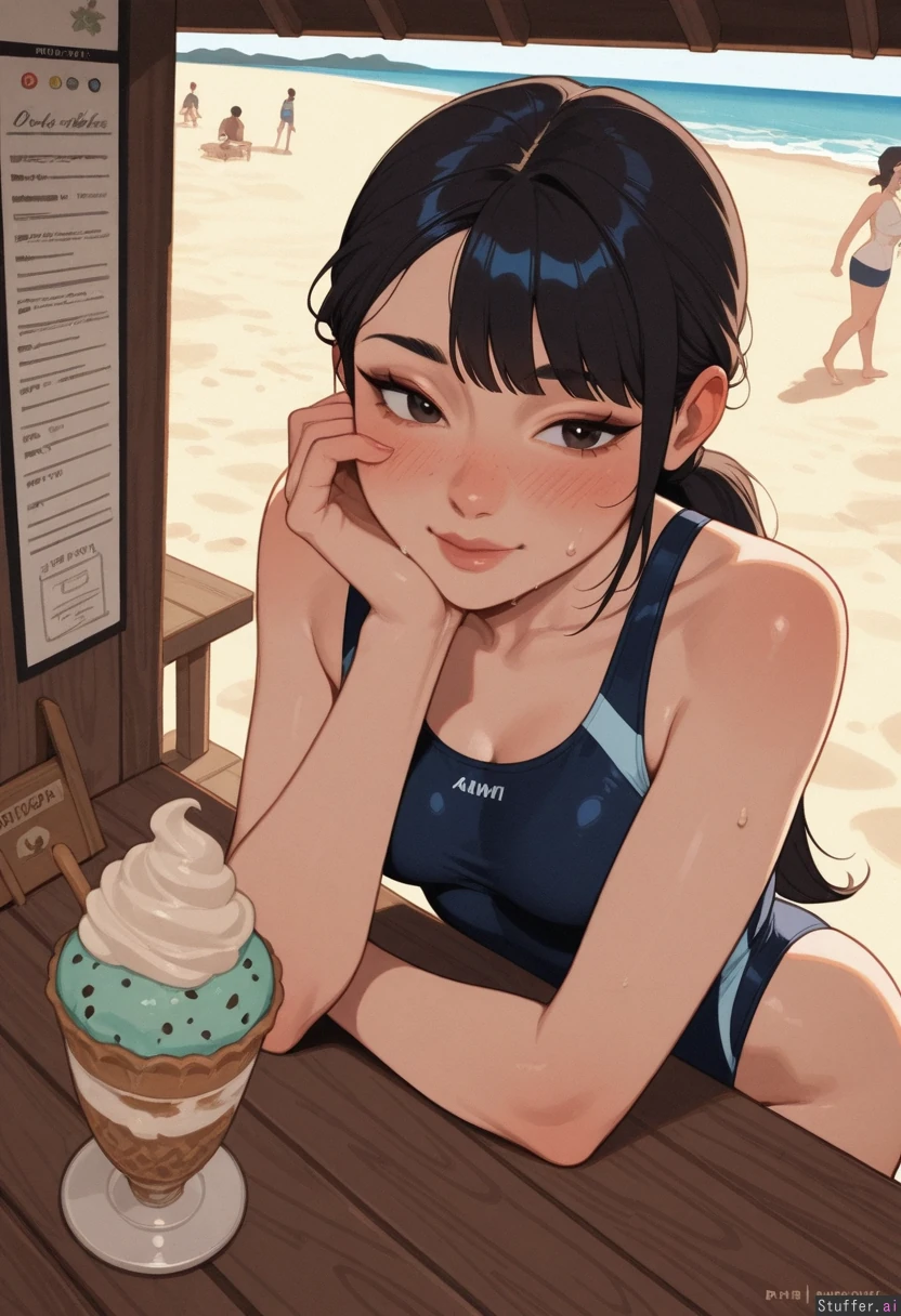 Highly detailed, KAMII MOMORU (artist), beach, leaning forward on merchant counter, ice cream vendor, ordering ice cream 1girl, Japanese girl, asian, cute, long hair, black hair, low-ponytail, black unipiece swimsuit, skinny, blushing, sweating, (beautiful face:1.2), side bangs