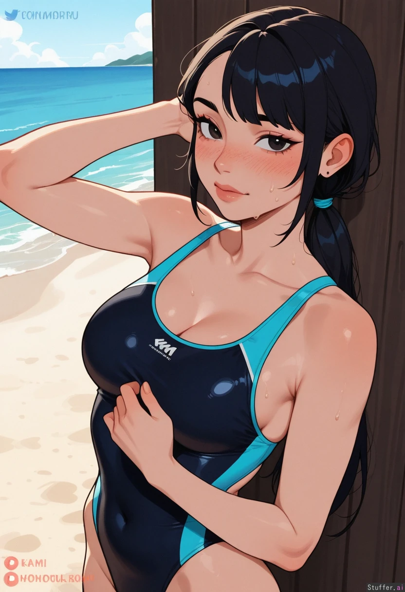 Highly detailed, KAMII MOMORU (artist), beach 1girl, Japanese girl, asian, cute, long hair, black hair, low-ponytail, black unipiece swimsuit, skinny, blushing, sweating, (beautiful face:1.2), side bangs