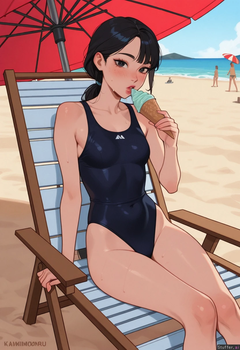 Highly detailed, KAMII MOMORU (artist), beach, eating ice cream cone, sitting on beach chair, solo, Parasol, beach background, people on background 1girl, Japanese girl, asian, cute, long hair, black hair, low-ponytail, black unipiece swimsuit, skinny, blushing, sweating, (beautiful face:1.2), side bangs