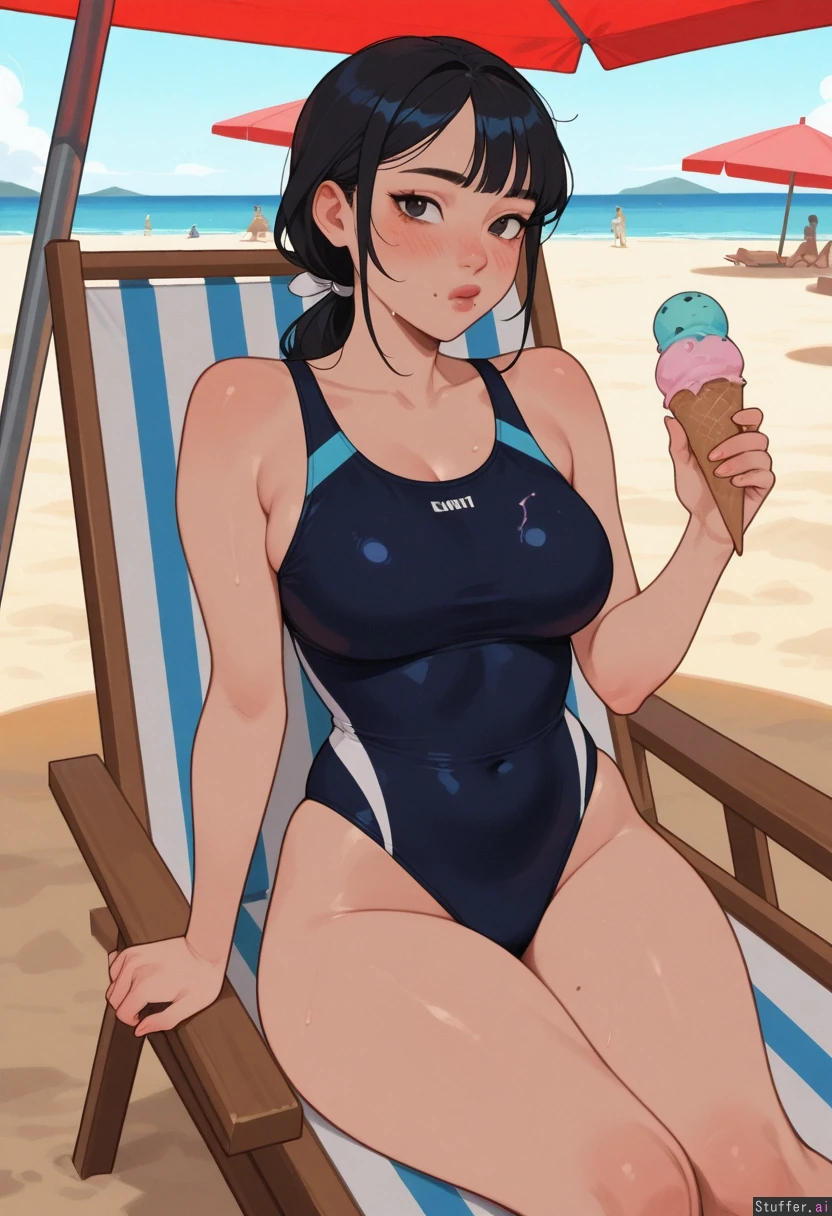 Highly detailed, KAMII MOMORU (artist), beach, sitting on beach chair, solo, Parasol, beach background, people on background, eating a lot of ice cream, (holding an ice cream cone in each hand:1.2) 1girl, Japanese girl, asian, cute, long hair, black hair, low-ponytail, black unipiece swimsuit, blushing, sweating, (beautiful face:1.2), side bangs, stuffed