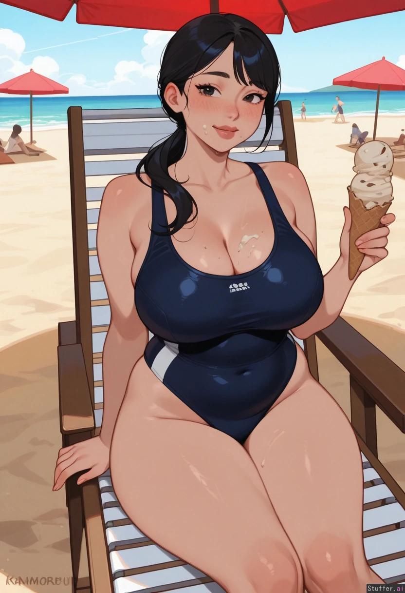 Highly detailed, KAMII MOMORU (artist), beach, sitting on beach chair, solo, Parasol, beach background, people on background, holding 3 ice creams 1girl, Japanese girl, asian, cute, long hair, black hair, low-ponytail, black unipiece swimsuit, blushing, sweating, (beautiful face:1.2), side bangs, stuffed, (slightly chubby:1), ice cream crumbs on face, ice cream crumbs