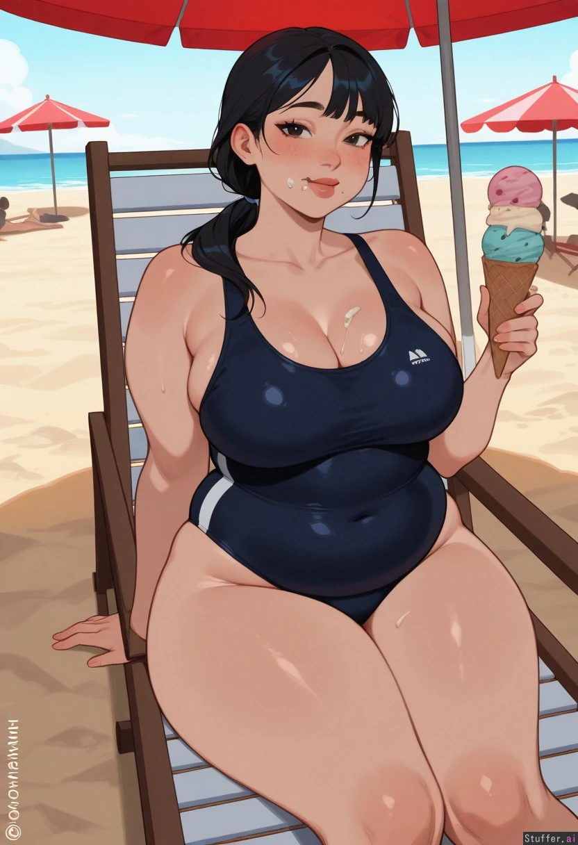 Highly detailed, KAMII MOMORU (artist), beach, sitting on beach chair, solo, Parasol, beach background, people on background, holding 3 ice creams, eating ice cream 1girl, Japanese girl, asian, cute, long hair, black hair, low-ponytail, black unipiece swimsuit, blushing, sweating, (beautiful face:1.2), side bangs, stuffed, (chubby:1.2), ice cream crumbs on face, ice cream crumbs