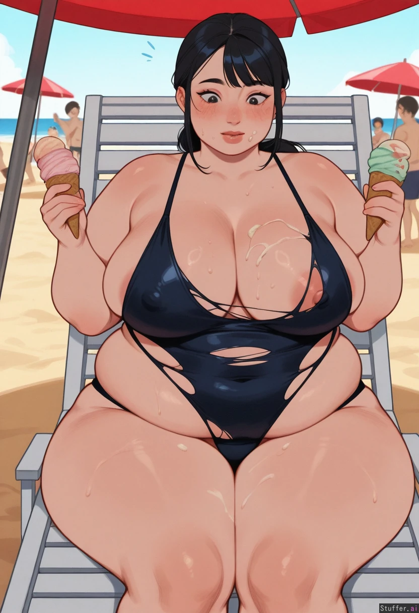 Highly detailed, KAMII MOMORU (artist), beach, sitting on beach chair, solo, Parasol, beach background, people on background, holding 3 ice creams, eating ice cream 1girl, Japanese girl, asian, cute, long hair, black hair, low-ponytail, black unipiece swimsuit, blushing, sweating, (beautiful face:1.2), side bangs, stuffed, (obese:1.3), ice cream crumbs on face, ice cream crumbs, (ripping swimsuit:1.5), surprised, confused, looking at herself, looking down, nipples slip out