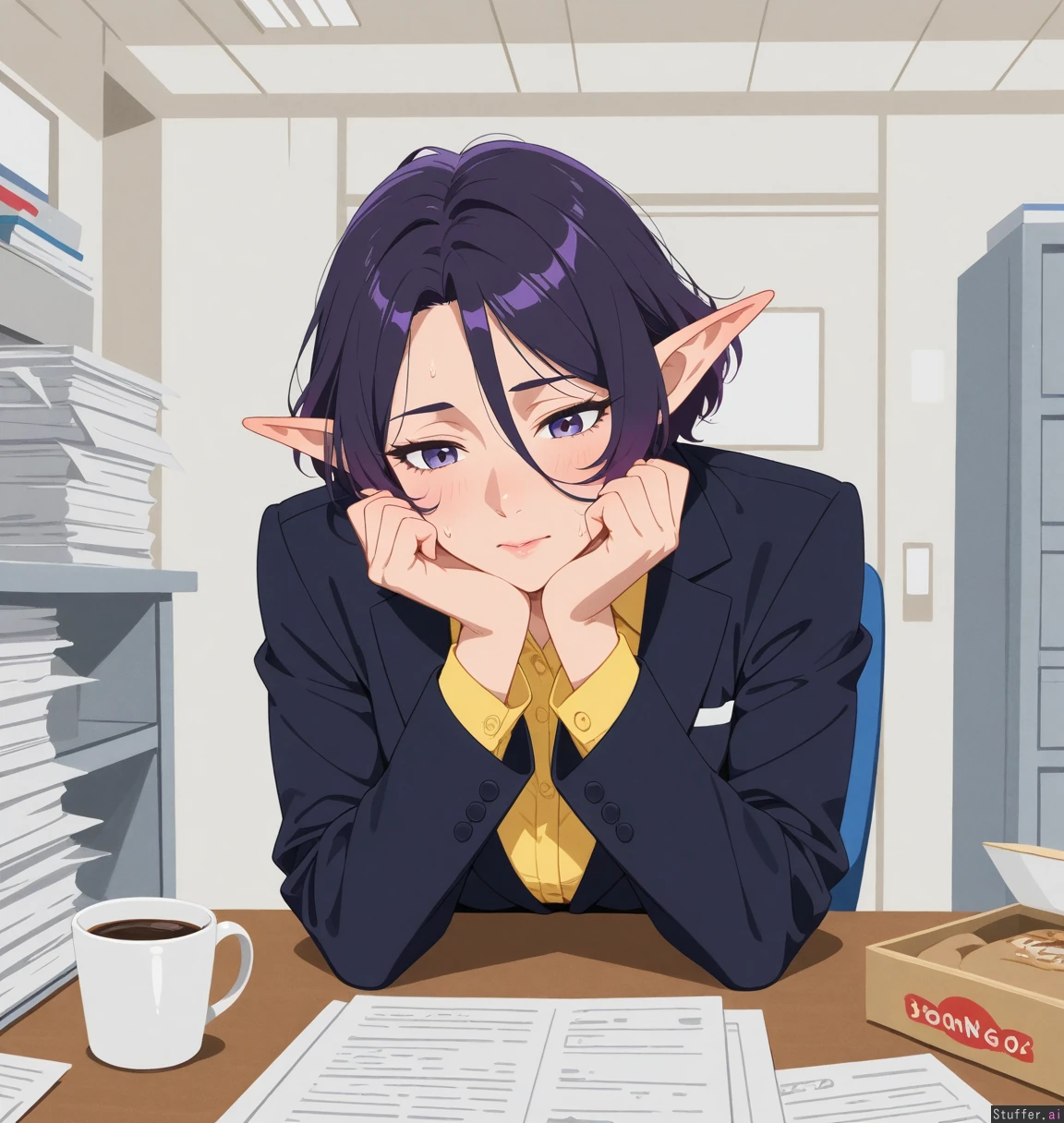 uhd, high resolution, flawless, best_quality, (hdr), (long eyelashes, makeup:1.2) (flat_color, lineless:1.4), perfect anatomy, beautiful face, beautiful eyes, Tweedabop(artist), Gobbocks(artist), w-oo-t(artist), perfect hands ((Solo)), ((mature)) Elf, ((short hair)), black hair, purple hair highlights, choppy hair, long bangs, black blazer, yellow button down shirt, black slacks business office, desk, messy papers, coffee mug, donut box tired, flustered, sweating
