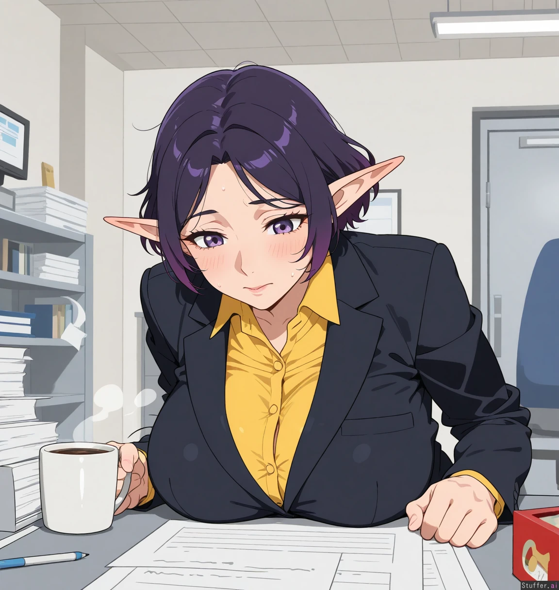 uhd, high resolution, flawless, best_quality, (hdr), (long eyelashes, makeup:1.2) (flat_color, lineless:1.4), perfect anatomy, beautiful face, beautiful eyes, Tweedabop(artist), Gobbocks(artist), w-oo-t(artist), perfect hands ((Solo)), ((mature)) Elf, ((short hair)), black hair, purple hair highlights, choppy hair, long bangs, black blazer, yellow button down shirt, black slacks business office, desk, messy papers, coffee mug, donut box tired, flustered, sweating (breast expansion)