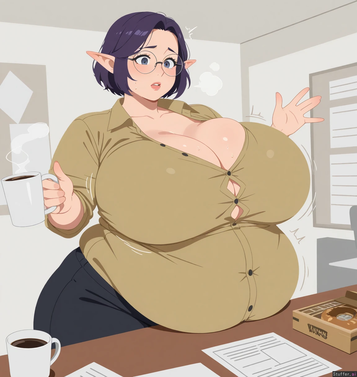 uhd, high resolution, flawless, best_quality, (hdr), (long eyelashes, makeup:1.2) (flat_color, lineless:1.4), perfect anatomy, beautiful face, beautiful eyes, Tweedabop(artist), Gobbocks(artist), w-oo-t(artist), perfect hands ((Solo)), ((mature)) Elf, ((short hair)), black hair, purple hair highlights, choppy hair, bangs, yellow button down shirt, black slacks, circular glasses, wardrobe malfunction, button gap business office, desk, messy papers, coffee mug, donut box tired, flustered, sweating, ((out of breath)) ((breast expansion)), ((overflowing cleavage)) (wide hips) love handles fat belly huge belly ((obese))