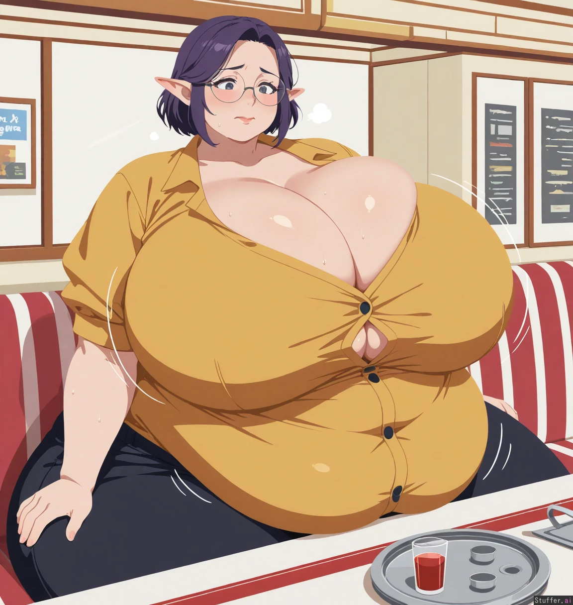 uhd, high resolution, flawless, best_quality, (hdr), (long eyelashes, makeup:1.2) (flat_color, lineless:1.4), perfect anatomy, beautiful face, beautiful eyes, Tweedabop(artist), Gobbocks(artist), w-oo-t(artist), perfect hands ((Solo)), ((mature)) Elf, ((short hair)), black hair, purple hair highlights, choppy hair, bangs, yellow button down shirt, black slacks, circular glasses, wardrobe malfunction, button gap diner, sitting tired, ((embarrassed)), flustered, sweating, ((out of breath)) ((breast expansion)), ((overflowing cleavage)) gigantic breasts (wide hips) love handles fat belly huge belly (((morbidly obese)))
