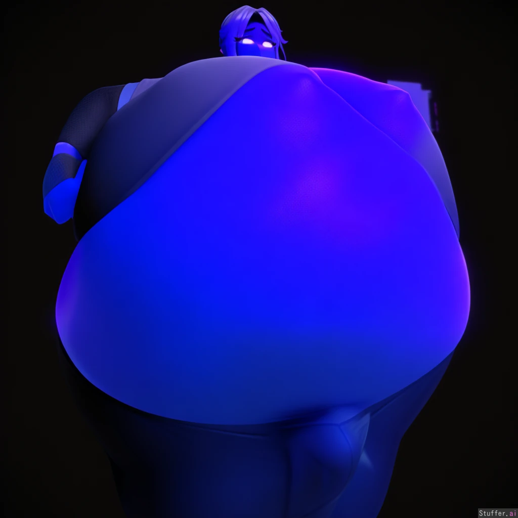 best quality, high rating, (((3D, 3D model, 3D character, vrchat))), solo, futa, blueberry inflation, dark blueberry colored skin, human, chewing, spherical inflation, uncomfortably full, rolling, colossal erection, erection under clothes