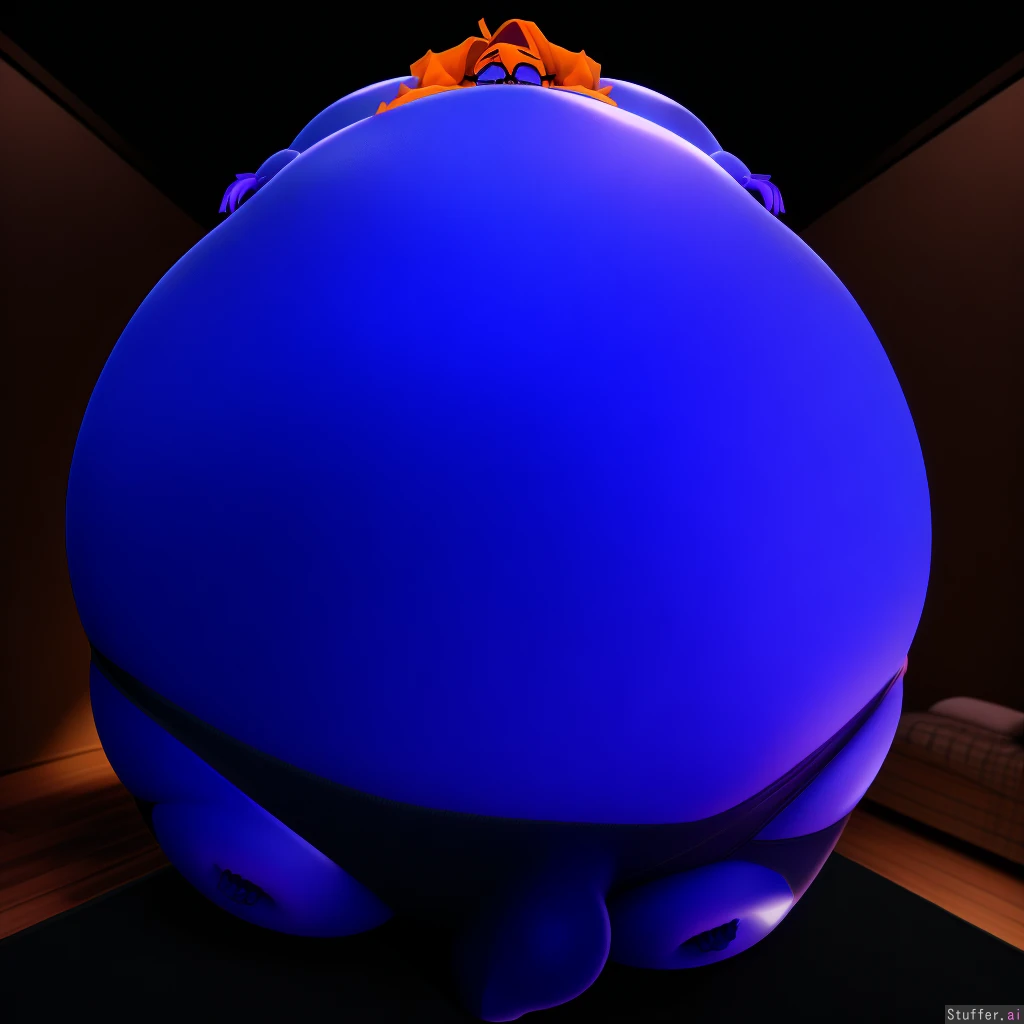 best quality, high rating, (((3D, 3D model, 3D character, vrchat))), anime eyes, orange wavy hair, solo, futa, blueberry inflation, dark blueberry colored skin, human, chewing, spherical inflation, uncomfortably full, rolling, colossal erection, erection under clothes, dim vibrant bedroom