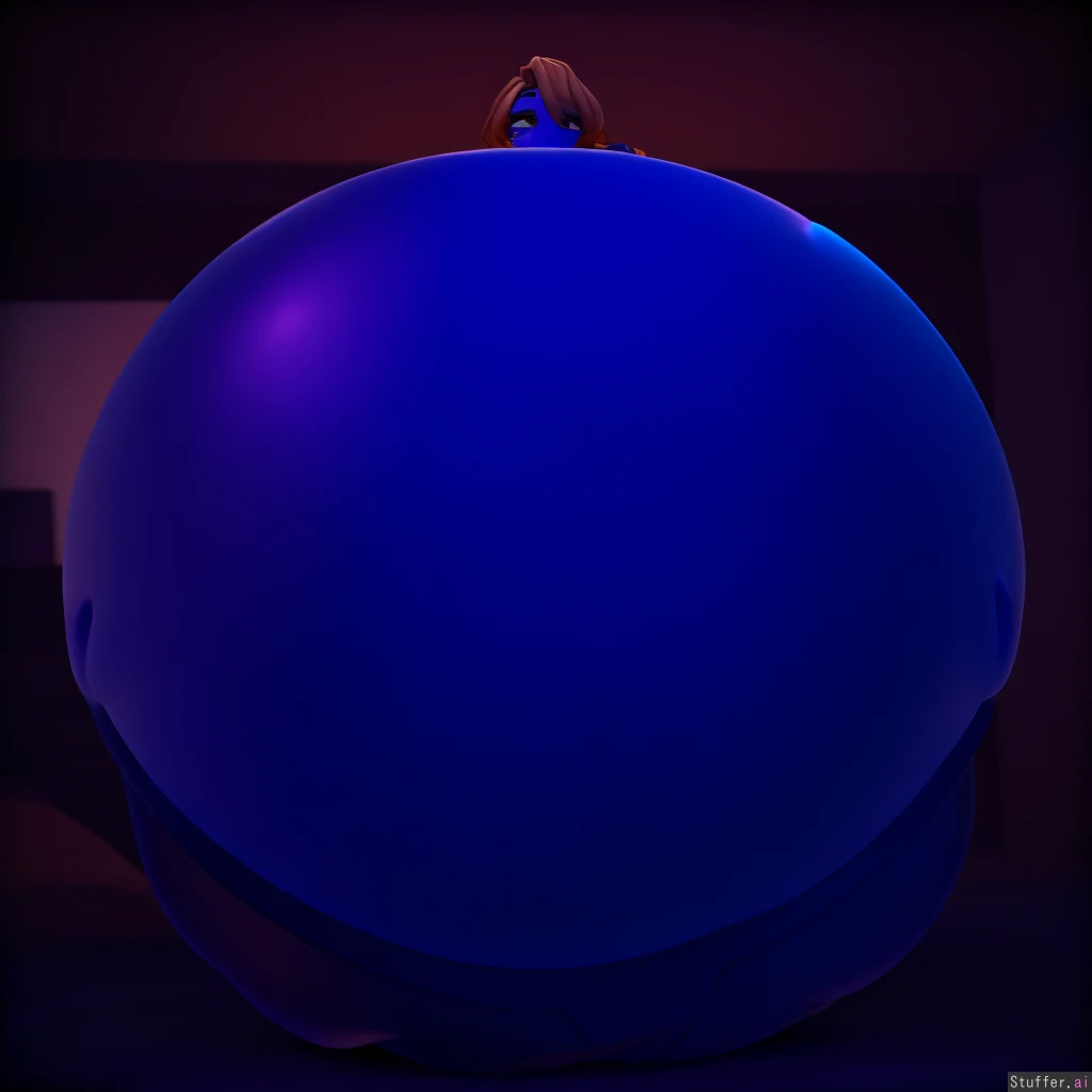 best quality, high rating, (((3D, 3D model, 3D character, highly detailed, perfect textures, vrchat))), anime eyes, orange wavy hair, solo, futa, blueberry inflation, dark blueberry colored skin, human, chewing, spherical inflation, uncomfortably full, rolling, colossal erection, erection under clothes, dim vibrant bedroom