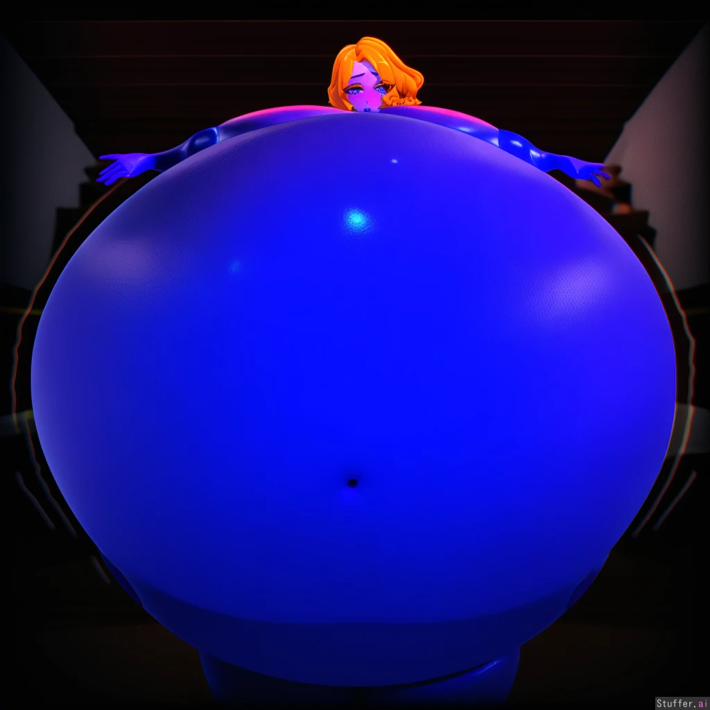 best quality, high rating, (((3D, 3D model, 3D character, highly detailed, flawless, perfect textures, vrchat))), anime eyes, orange wavy hair, solo, blueberry inflation, dark blueberry colored skin, human, chewing, spherical inflation, uncomfortably full, dazed, dim vibrant bedroom, huge round breasts, dome shaped breasts