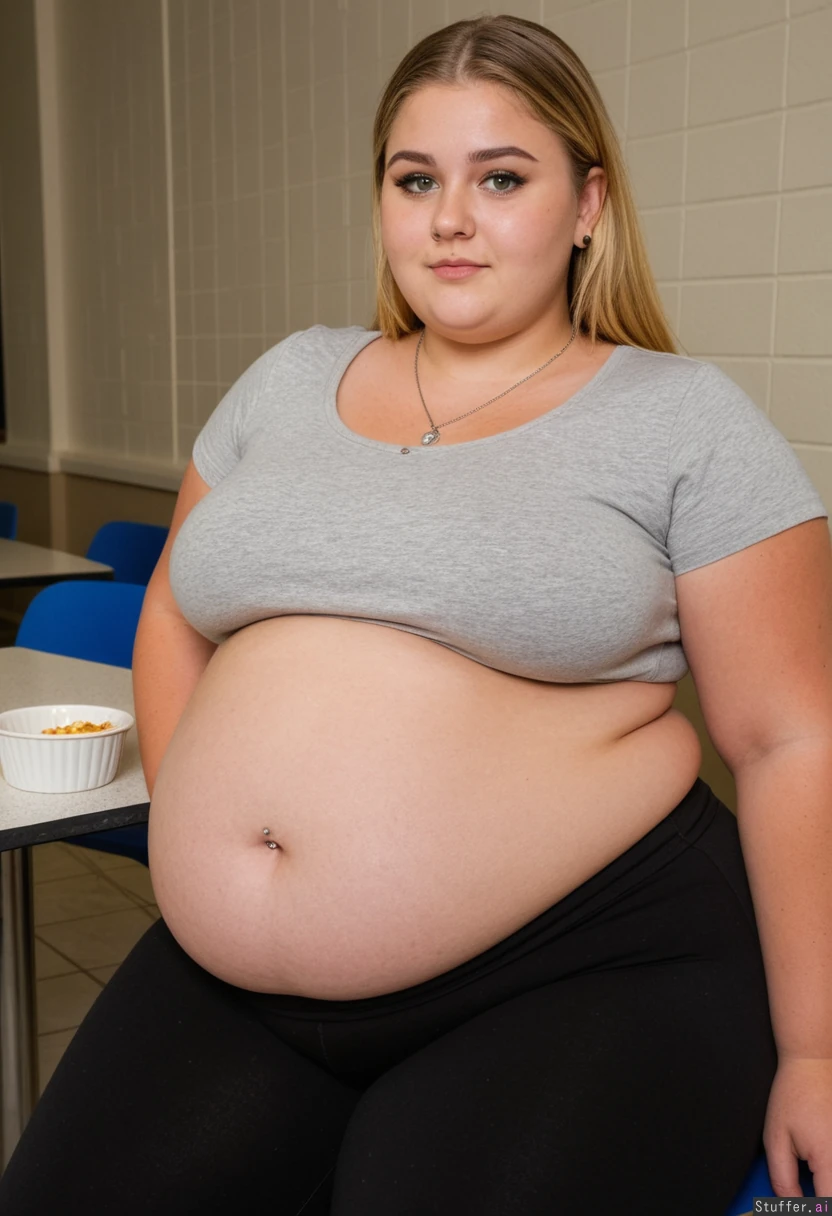 (((Perfect Realistic photo, Chloe, Beautiful 21-year-old shorter fat college alt TikTok e-girl, she is standing, she is 4 foot 11 inches, she is not curvy but she is just fat, she is extremely turned on by her rapid weight gain, zoomed out shot, Caucasian, slightly tanned, fat arms and shoulders, her hips and waist are the same width, perfect gorgeous short plump freshman girl, very cute, slightly goth look, she is a feedee, she wants to become completely obese, she weighs 250 pounds, semi-side view, she is sitting in the cafeteria messily and extremely gluttonously eating an extremely fattening feast, she cant stop overeating, extreme slob glutton, she loves binge eating and gaining weight))), perfect lighting, ((wearing a perfect full grey white t-shirt and black cotton leggings pants that covers her entire torso, her t-shirt must completely cover her belly, silver necklace, ear piercings, small septum piercing, her obese body must be completely clothed:1.6)), ((((ultrarealistic, perfect quality, strong prompt strength, 4K HD, masterpiece, perfect daytime lighting)))), (((perfect gorgeous face, heavy alt e-girl makeup, slightly square jaw, heavy thick eyeliner, thick eyebrows, perfect green eyes, perfect teeth, light freckles))), realistic, vibrant colors, perfect daytime natural lighting, (very long blonde hair, bangs), ((((small button nose, high cheekbones, beauty, semi-side view)))), (((she is shorter))), (((((she has a gorgeous 21-year-old face and a extra plump obese body with a perfectly thick pot belly, her slender extremely gorgeous 19-year-old supermodel face contrasts with her perfectly proportioned hot 250 pound overall obese short body, muffintop)))))