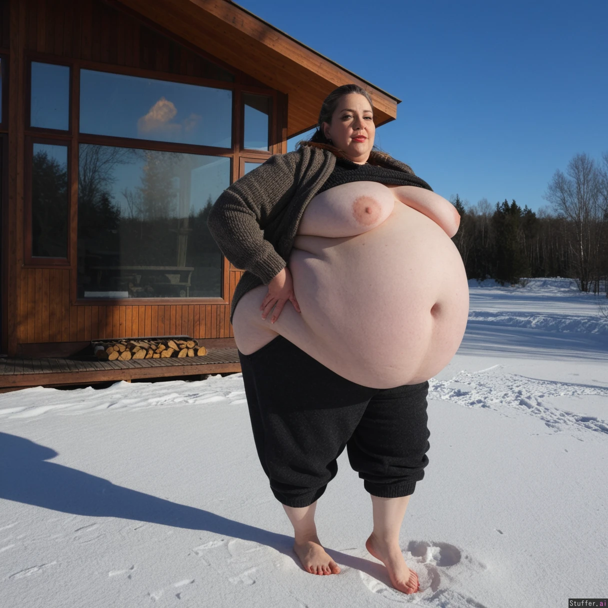 (A vintage portrait of subject walking casually under sun, snow effects, high contrast, cinematic set in Siberia style, emotional intensity), Extremely detailed ,(Middle aged hot milf, hot eyes,big_cheekbones,fat_lips,thick_eyebrows), (small tits,plump,bigass,fat arms, massive fat belly:1.1), (wearing woolen outdoor casual clothing outfit ,fully clothed:1.3) ,(, looking desperately at viewer), (cinematic realistic universe:1.4),(feet, fullbody view :1.6), massive wooden modern glass house, fireplace, moody atmosphere, morning, river,( gigantic belly :1.6),.
