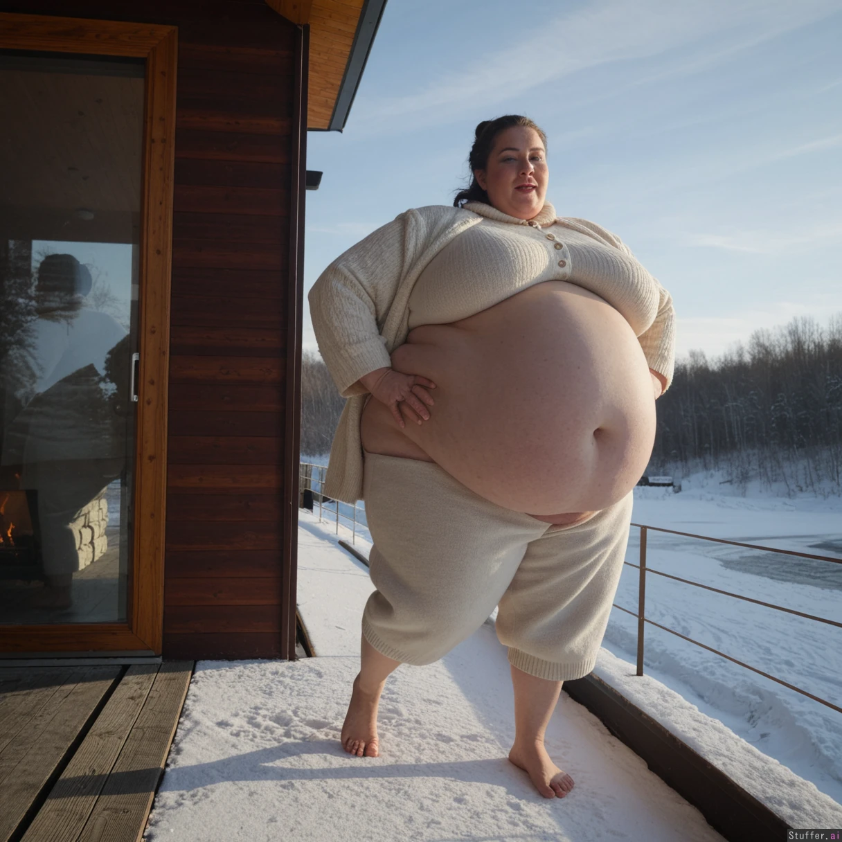 (A vintage portrait of subject walking casually under sun, snow effects, high contrast, cinematic set in Siberia style, emotional intensity), Extremely detailed ,(Middle aged hot milf, hot eyes,big_cheekbones,fat_lips,thick_eyebrows), (small tits,plump,bigass,fat arms, massive fat belly:1.1), (wearing light woolen outdoor casual clothing outfit ,fully clothed:1.3) ,(, looking desperately at viewer), (cinematic realistic universe:1.4),(feet, fullbody view :1.6), massive wooden modern glass house, fireplace, moody atmosphere, morning, river,( gigantic belly :1.6),.