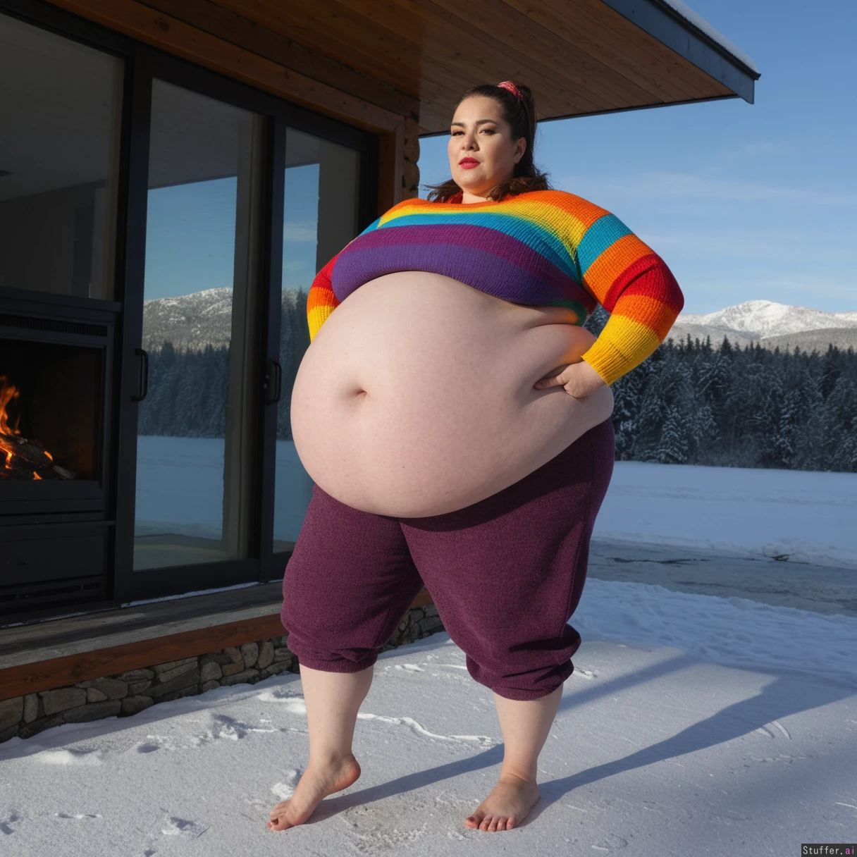 (A vintage portrait of subject walking casually under sun, snow effects, high contrast, cinematic set in Siberia style, emotional intensity), Extremely detailed ,(Middle aged hot milf, hot eyes,big_cheekbones,fat_lips,thick_eyebrows), (small tits,plump,bigass,fat arms, massive fat belly:1.1), (wearing colored woolen outdoor casual clothing outfit ,fully clothed:1.3) ,(, looking desperately at viewer), (cinematic realistic universe:1.4),(feet, fullbody view :1.6), massive wooden modern glass house, fireplace, moody atmosphere, morning, river,( gigantic belly :1.6),.