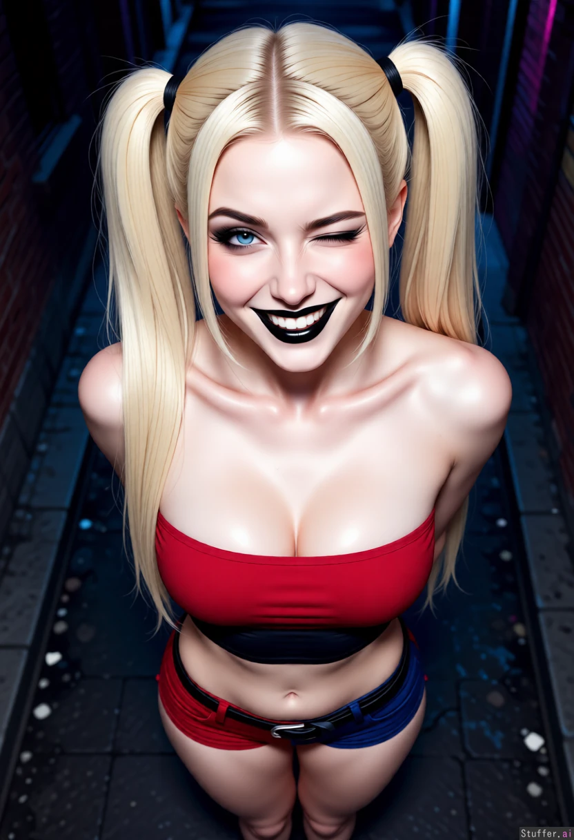 ((Ultra high quality)), (( realistic style)), ((realistic lighting)), rich colourful scheme, ((detailed skin)) 1 woman, Harley Quinn, very long pigtails blonde hair, blue eyes, black eyeliner, rolling eyes, white skin, black lipstick, Standing In a dark alley, joyfully smiling , arms behind her back, winking eye wearing red and black tube top and booty shorts thin face, cleavage, deep navel, voluptuous breast , wide hips, Viewed from above