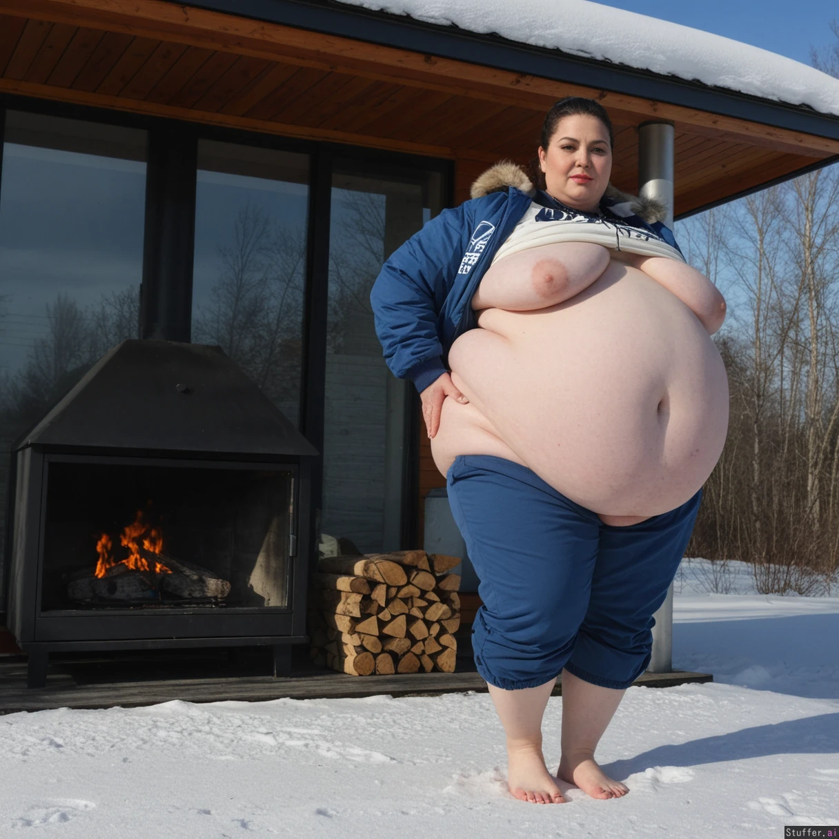 (A vintage portrait of subject walking casually under sun, snow effects, high contrast, cinematic set in Siberia style, emotional intensity), Extremely detailed ,(Middle aged hot milf, hot eyes,big_cheekbones,fat_lips,thick_eyebrows), (small tits,plump,bigass,fat arms, massive fat belly:1.1), (wearing Siberian outdoor casual clothing outfit ,fully clothed:1.3) ,(, looking desperately at viewer), (cinematic realistic universe:1.4),(feet, fullbody view :1.6), massive wooden modern glass house, fireplace, moody atmosphere, morning, river,( gigantic belly :1.6),.