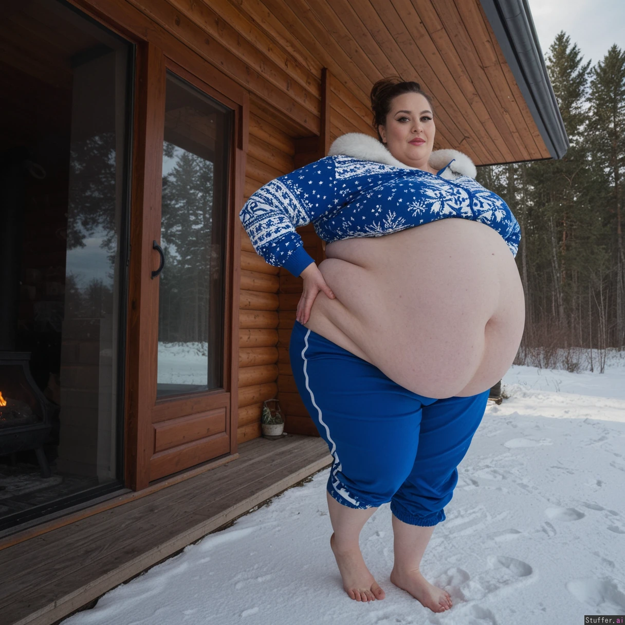(A vintage portrait of subject walking casually under sun, snow effects, high contrast, cinematic set in Siberia style, emotional intensity), Extremely detailed ,(Middle aged hot milf, hot eyes,big_cheekbones,fat_lips,thick_eyebrows), (small tits,plump,bigass,fat arms, massive fat belly:1.1), (wearing Russian outdoor casual clothing outfit ,fully clothed:1.3) ,(, looking desperately at viewer), (cinematic realistic universe:1.4),(feet, fullbody view :1.6), massive wooden modern glass house, fireplace, moody atmosphere, morning, river,( gigantic belly :1.6),.