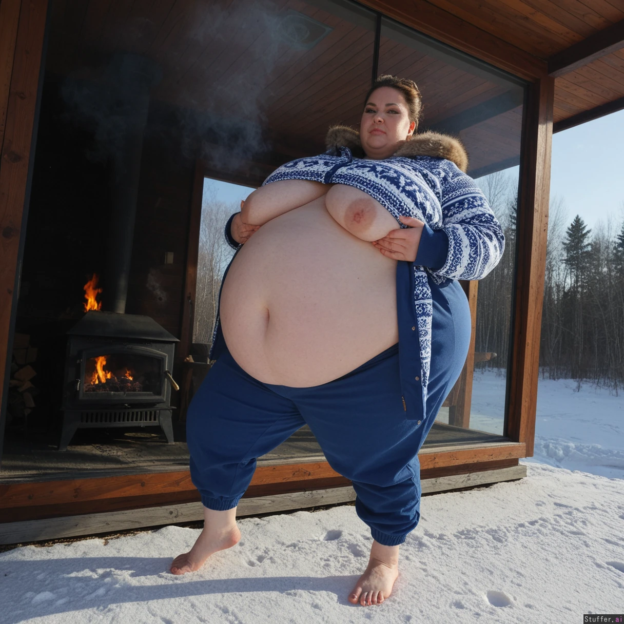 (A vintage portrait of subject walking casually under sun, snow effects, high contrast, cinematic set in Siberia style, emotional intensity), Extremely detailed ,(Middle aged hot milf, hot eyes,big_cheekbones,fat_lips,thick_eyebrows), (small tits,plump,bigass,fat arms, massive fat belly:1.1), (wearing Russian outdoor casual clothing outfit ,fully clothed:1.3) ,(, looking desperately at viewer), (cinematic realistic universe:1.4),(feet, fullbody view :1.6), massive wooden modern glass house, fireplace, moody atmosphere, morning, river,( gigantic belly :1.6),.