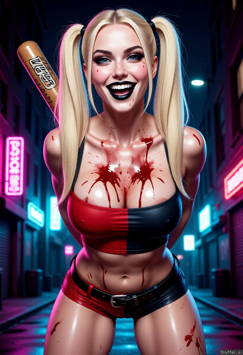 ((Ultra high quality)), (( realistic style)), ((realistic lighting)), rich colourful scheme, ((detailed skin)) 1 athletic woman, Harley Quinn, very long pigtails blonde hair, blue eyes, black eyeliner, rolling eyes, white skin, black lipstick, big eyes wide open Standing In a dark alley, joyfully smiling , holding a baseball bat behind her back, wearing red and black tube top and booty shorts thin face, covered with blood cleavage, deep navel, huge breast , wide hips, Viewed from below