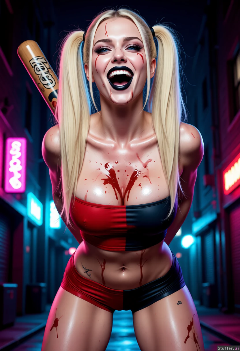 ((Ultra high quality)), (( realistic style)), ((realistic lighting)), rich colourful scheme, ((detailed skin)) 1 athletic woman, Harley Quinn, very long pigtails blonde hair, blue eyes, black eyeliner, rolling eyes, white skin, black lipstick, crazy eyes wide open Standing In a dark alley, crazy laughing , holding a baseball bat behind her back, wearing red and black tube top and booty shorts thin face, splattered with blood cleavage, deep navel, huge breast , wide hips, Viewed from below